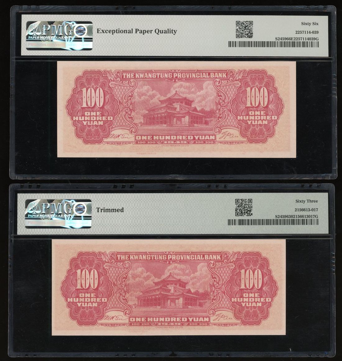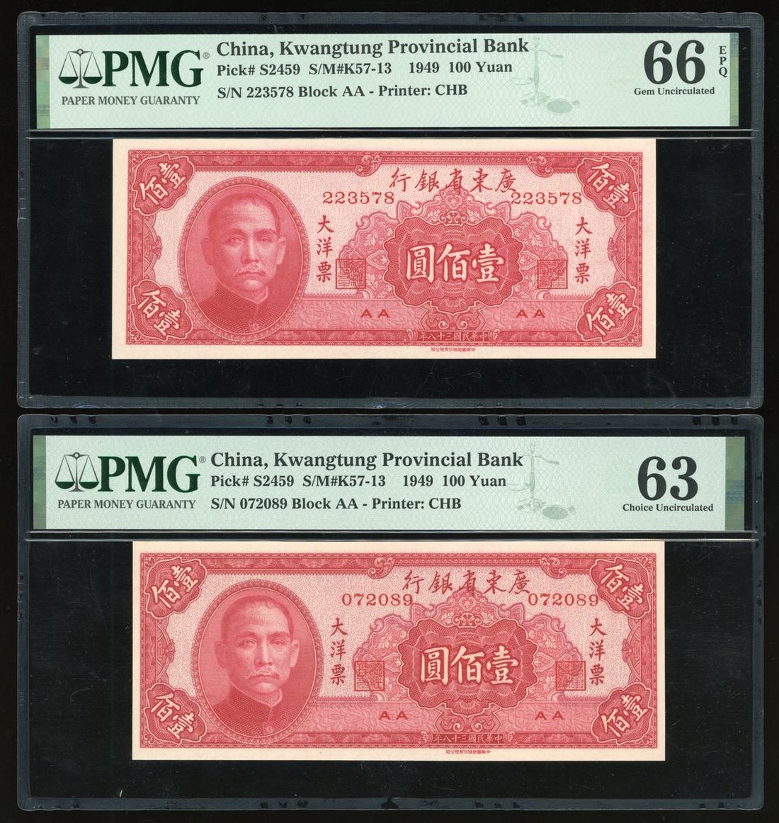 Kwangtung Provincial Bank, China, 100 yuan (2), 1949, serial numbers 223578 and 072089, (Pick S2459), PMG 66EPQ Gem Uncirculated and 63 Choice Uncirculated (2)