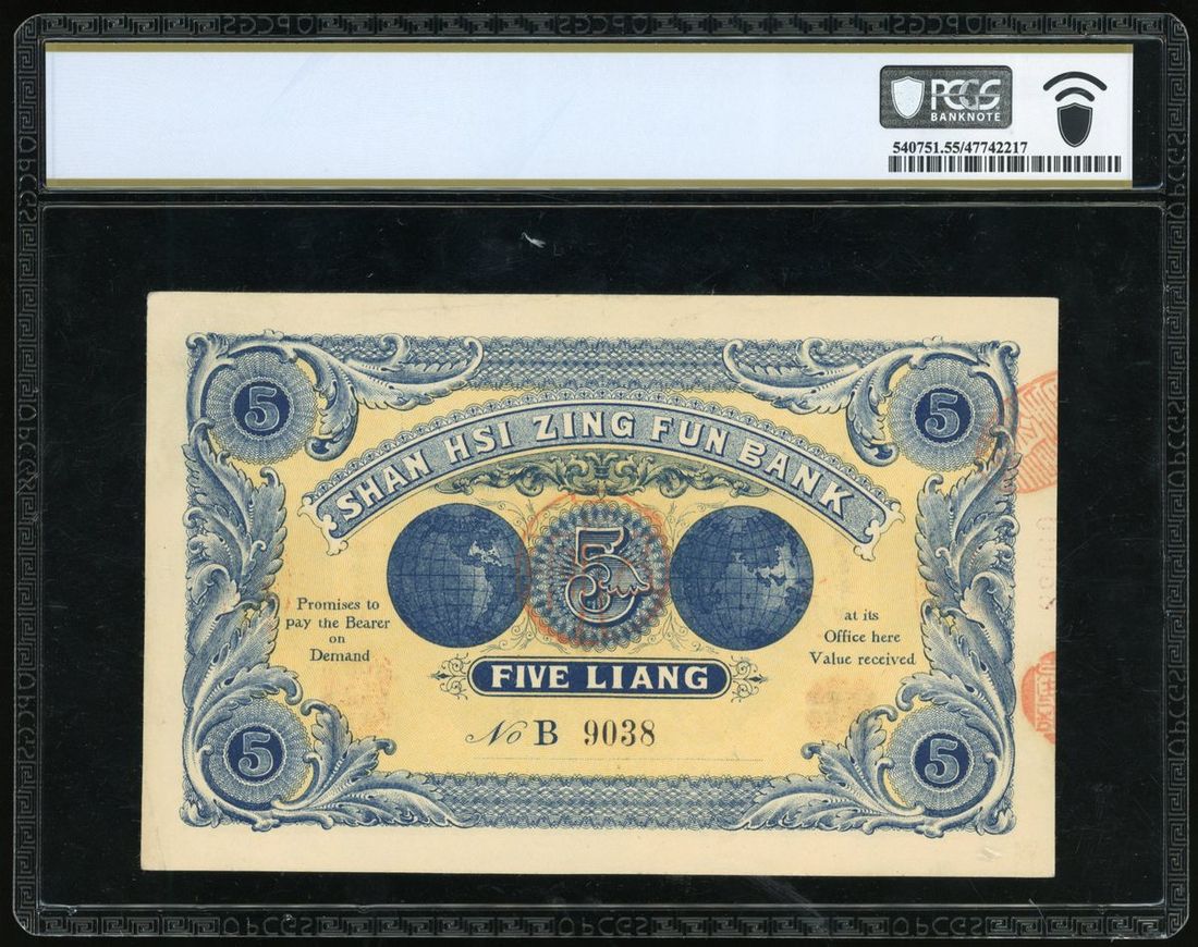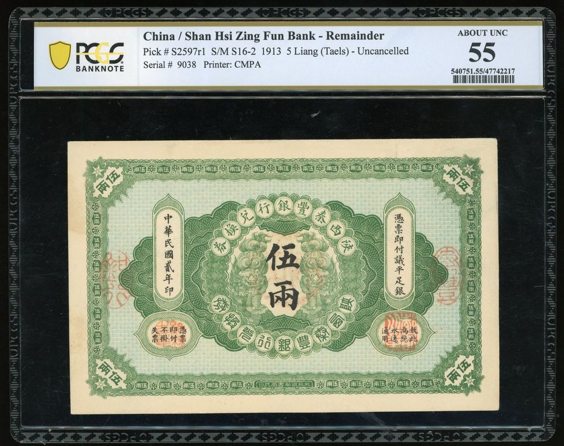 Shan Hsi Zing Fun Bank, China, 5 liang (taels), remainder, Year 2(1913), serial number 9038, uncancelled, (Pick S2597r1), PCGS Banknote 55 About Uncirculated, the second highest grade in population report, a handsome example of the type.