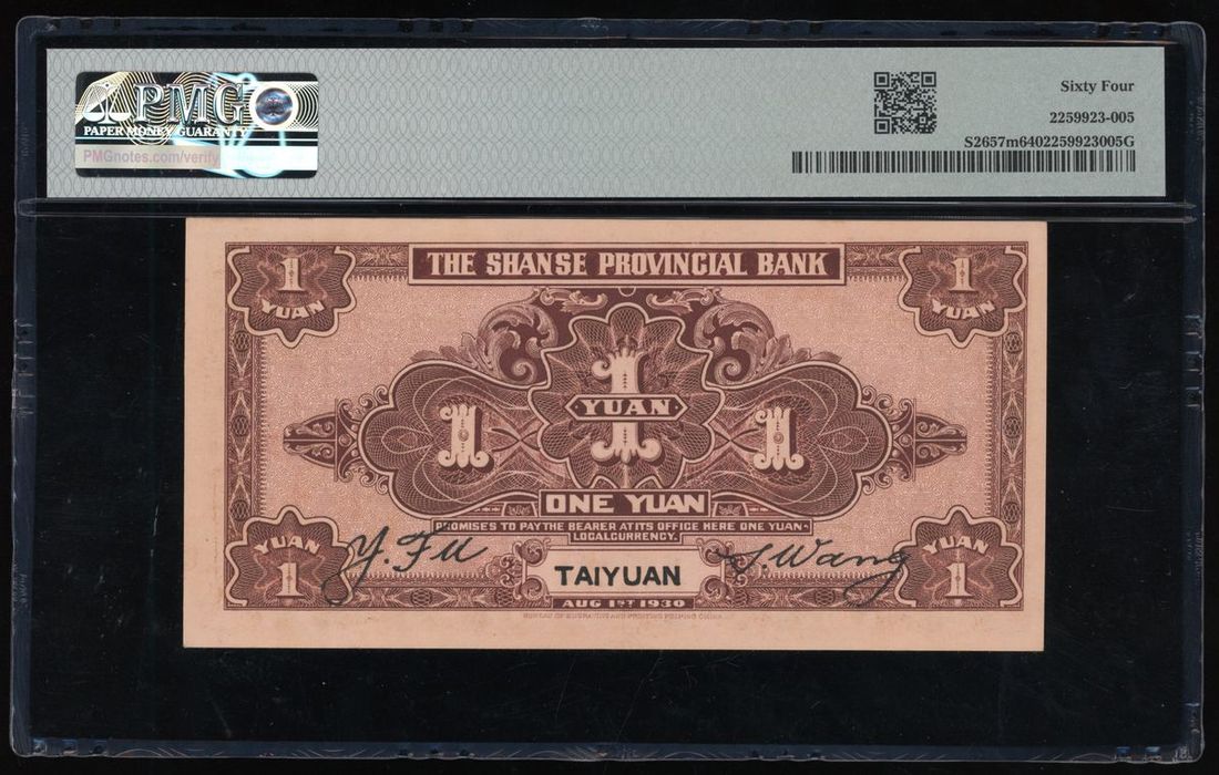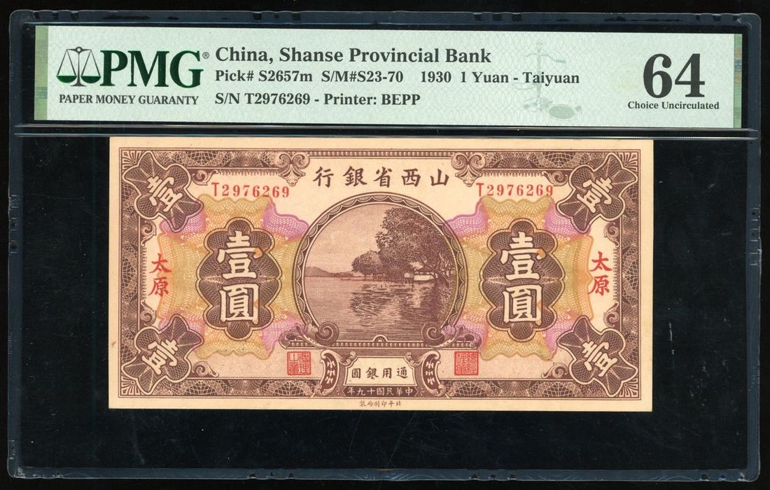 Shanse Provincial Bank, China, 1 yuan, Taiyuan, Year 19(1930), serial number T2976269, (Pick S2657m), PMG 64 Choice Uncirculated.