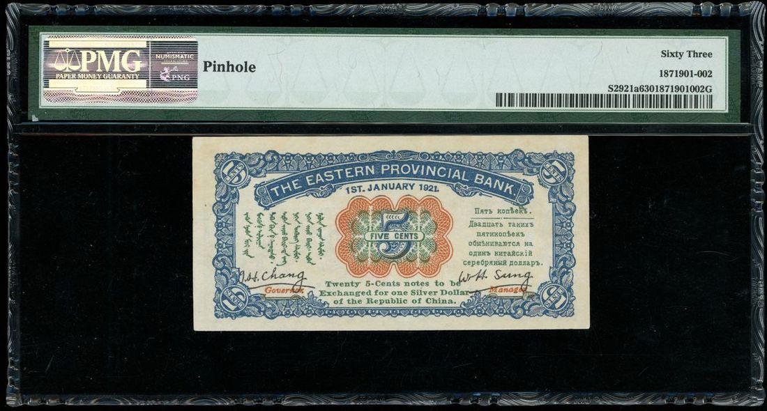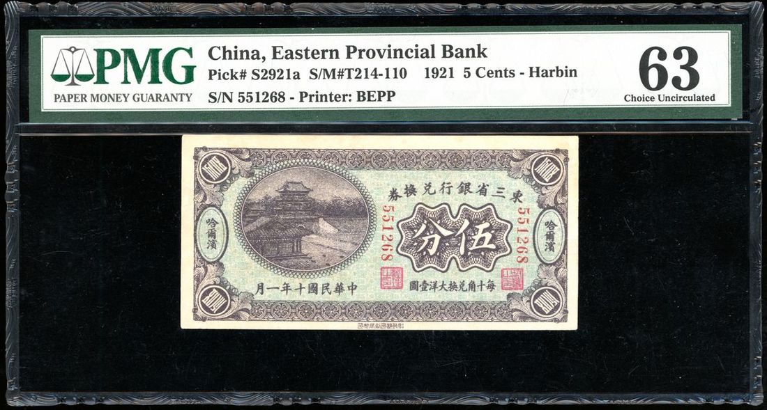 Eastern Provincial Bank, China, 5 cents, Harbin, Year 10(1921), serial number 551268, (Pick S2921a), PMG 63 Choice Uncirculated (Pinhole), the second highest grade in PMG population report.