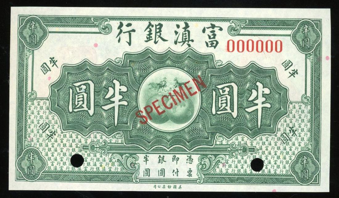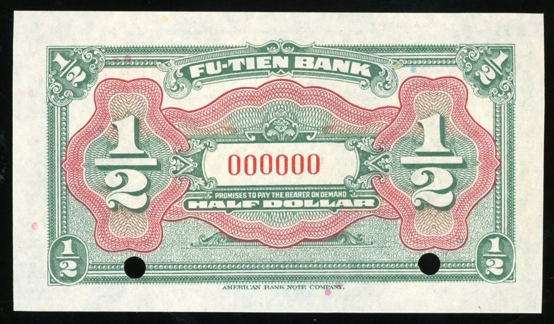 Fu Tien Bank, China, specimen half dollar, ND (1921), serial number 000000, (Pick S3013s), Uncirculated.