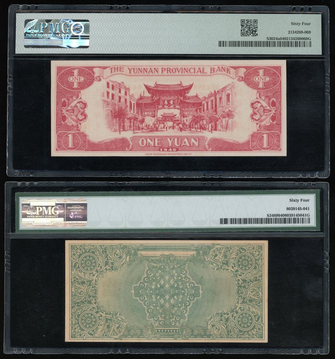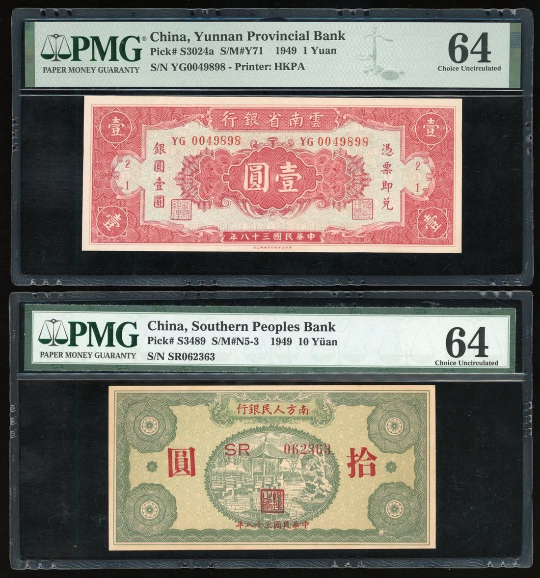 China, Republic, a group of 2x, including Yunnan Provincial Bank, 1 yuan ,1949, serial number YG0049898, and Southern Peoples Bank 10 yuan, 1949, serial number SR062363,