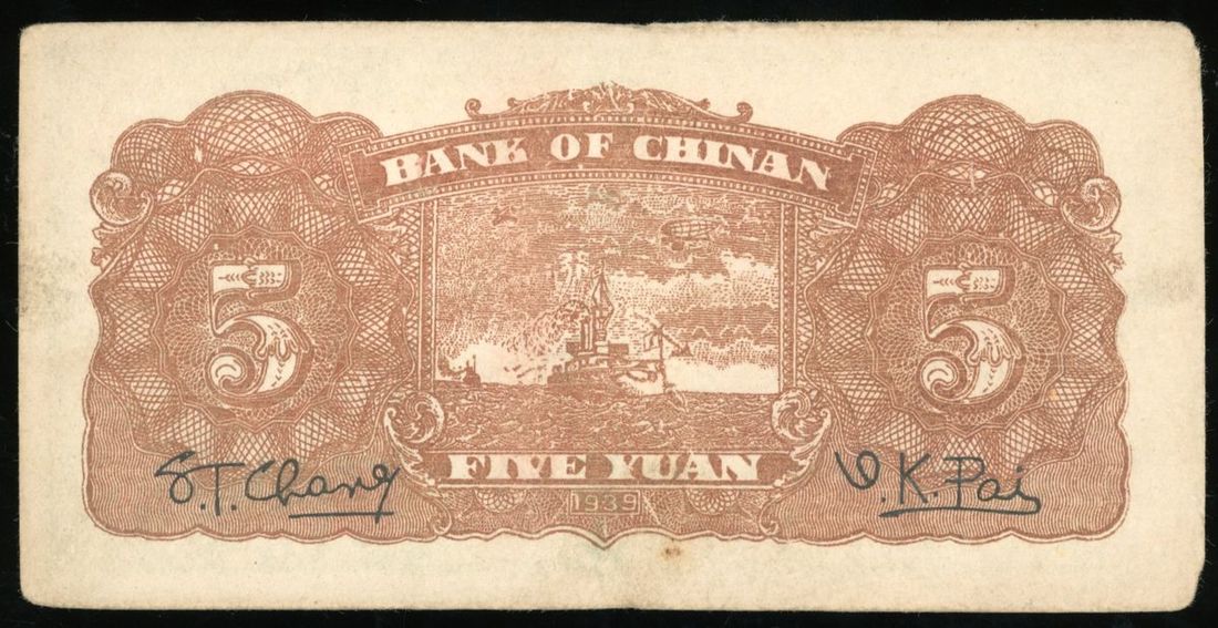 Bank of Chinan, China, 5 yuan, 1939, serial number J 547988, (Pick S3069), About Extremely Fine