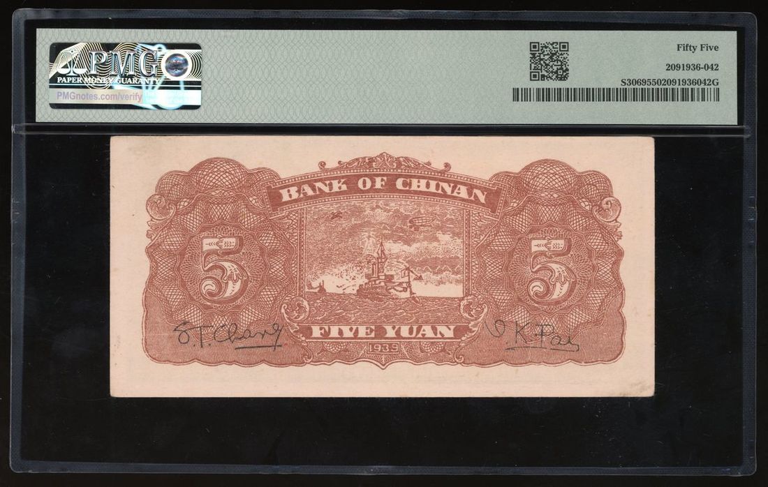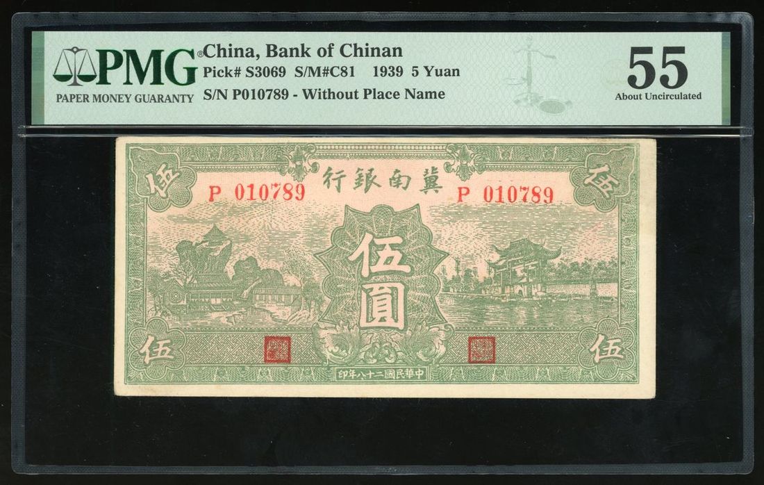 Bank of Chinan, China, 5 yuan, 1939, serial number 010789, (Pick S3069), PMG 55 About Uncirculated