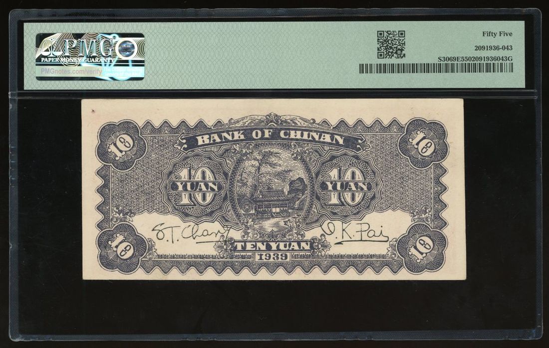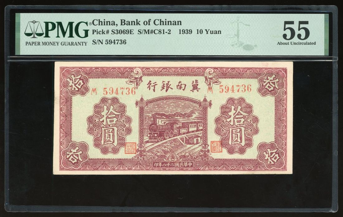 Bank of Chinan, China, 10 yuan, 1939, serial number 594736, (Pick S3069E), PMG 55 About Uncirculated