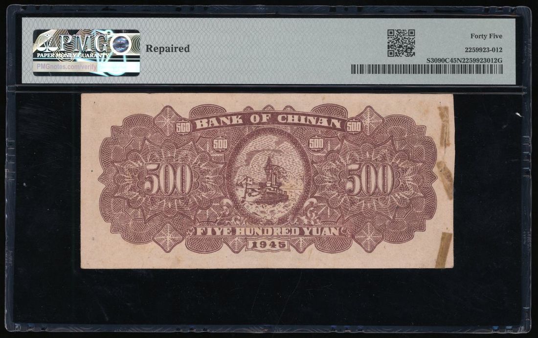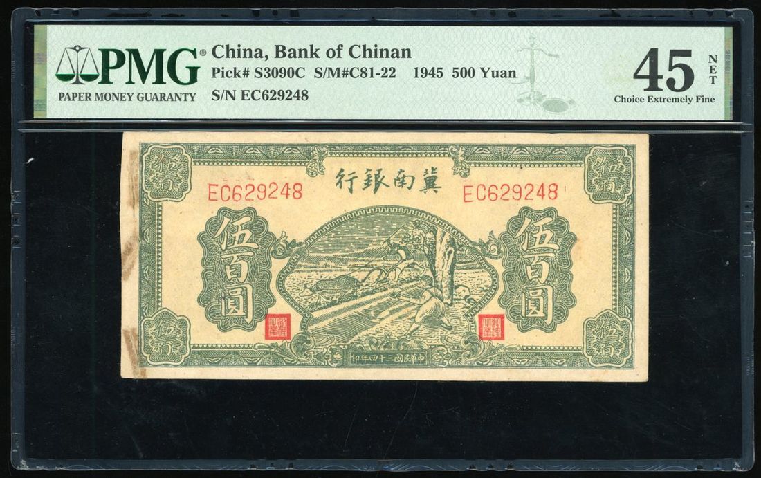 Bank of Chinan, China, 500 yuan, Year 34(1945), serial number EC629248, (Pick S3090C), PMG 45NET Choice Extremely Fine (Repaired).
