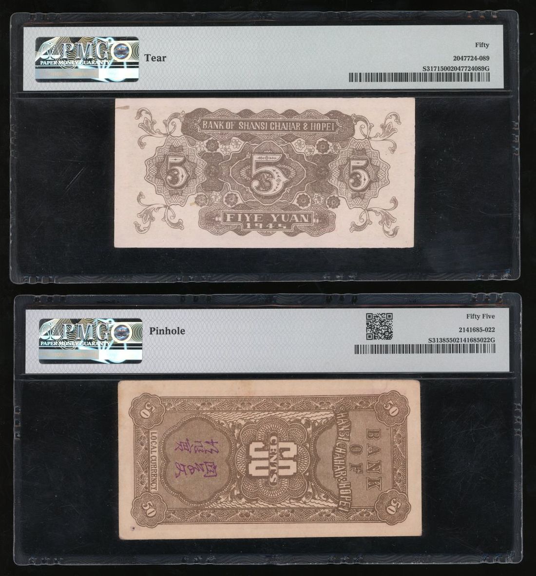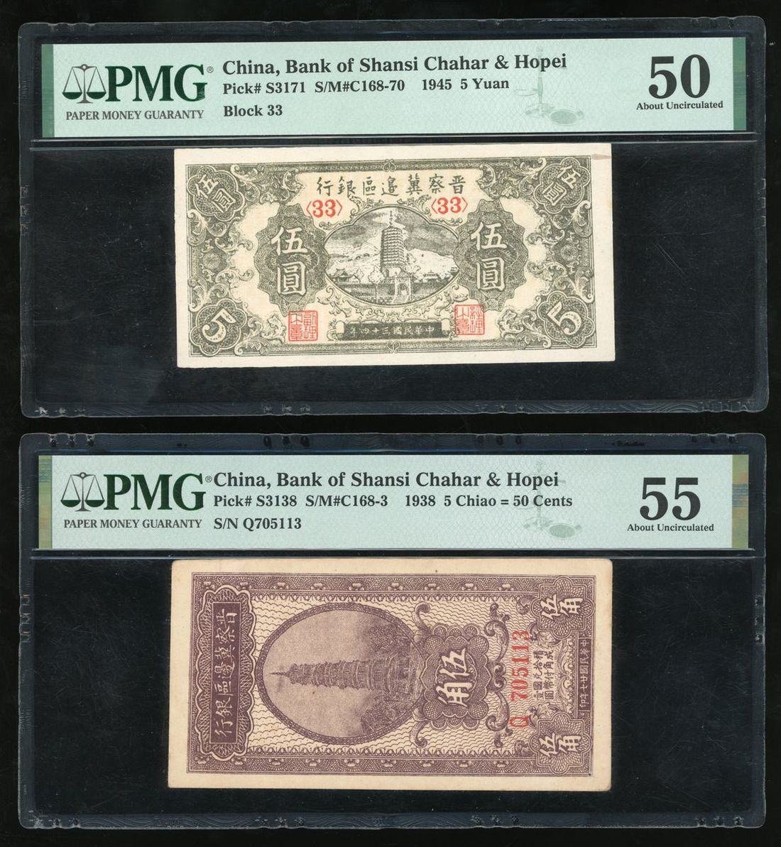 (x) Bank of Shansi Chahar & Hopei, China, a pair, including 50 cents 1938, and 5 yuan 1945, (Pick S3138, S3171), PMG 55 (pinhole), 50 (tear) (2)