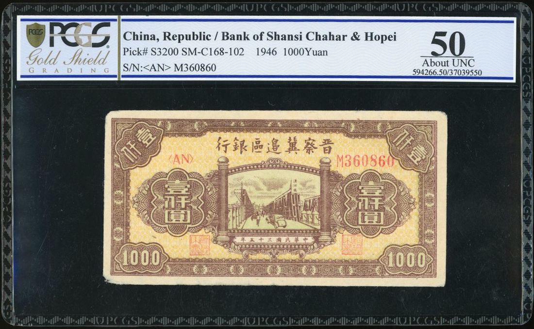 Bank of Shansi, Chahar and Hopei, China, 1000 yuan, Year 35(1946), serial number