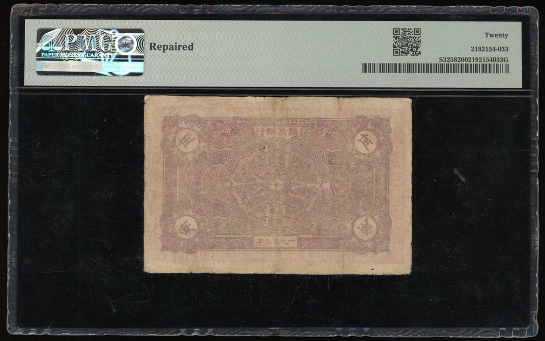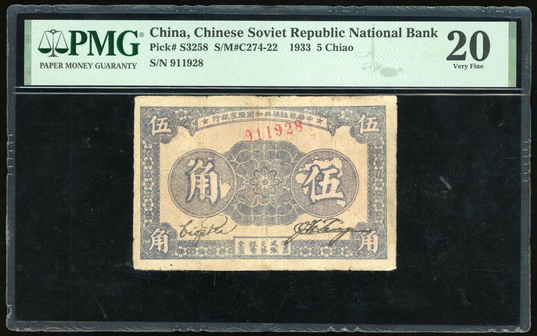 Chinese Soviet Republic National Bank, 5 chiao, 1933, serial number 911928, (Pick S3258), PMG 20, repaired.