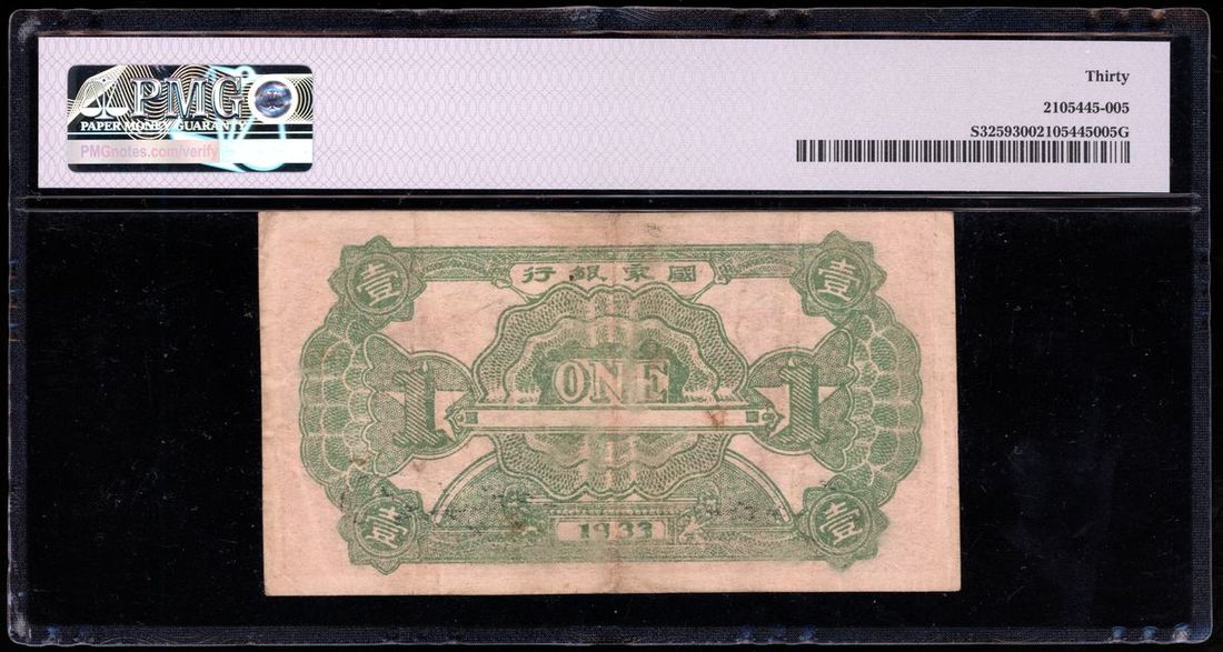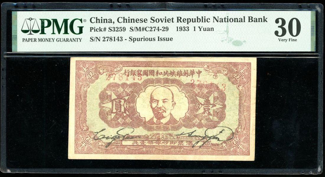Chinese Soviet Republic National Bank, 1 yuan, Year 22 (1933), serial number 278143, spurious issue, (Pick S3259), PMG 30 Very Fine. Scarce communist issue