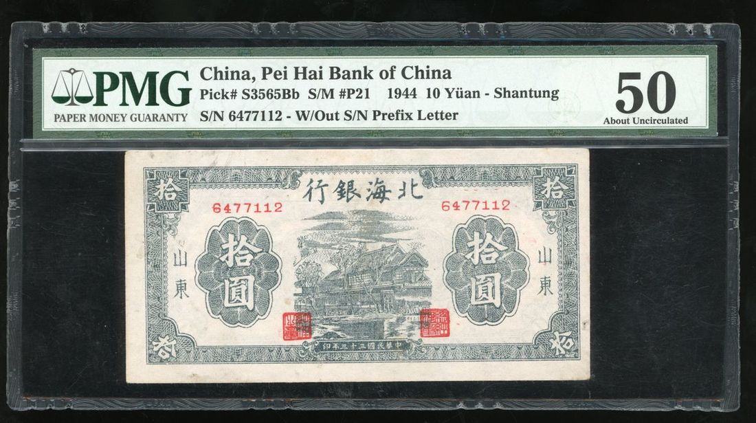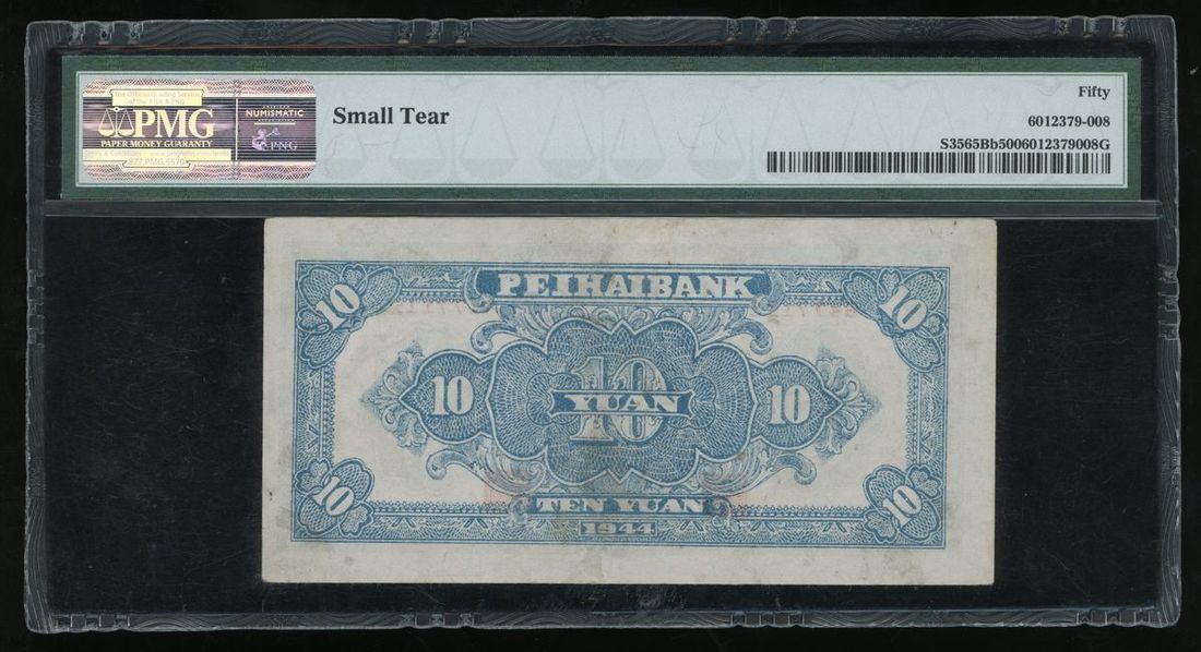 (x) Pei Hai Bank of China, 10 yuan, 1944, Shantung, serial number 6477112, (Pick S3565Bb), PMG 50, small tear