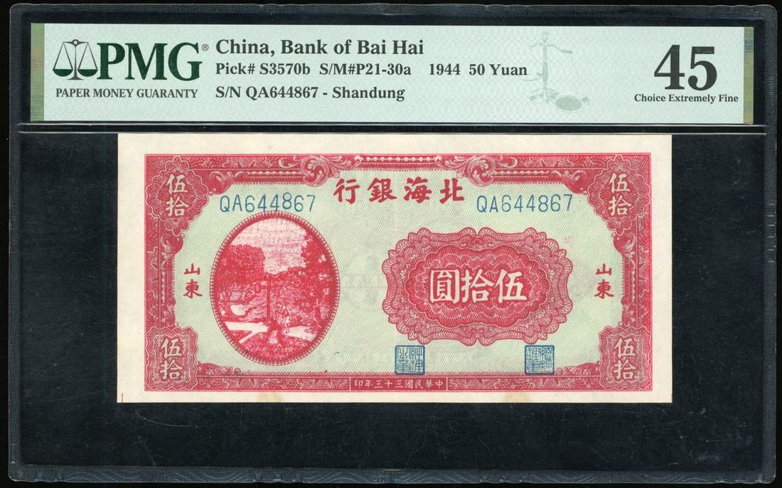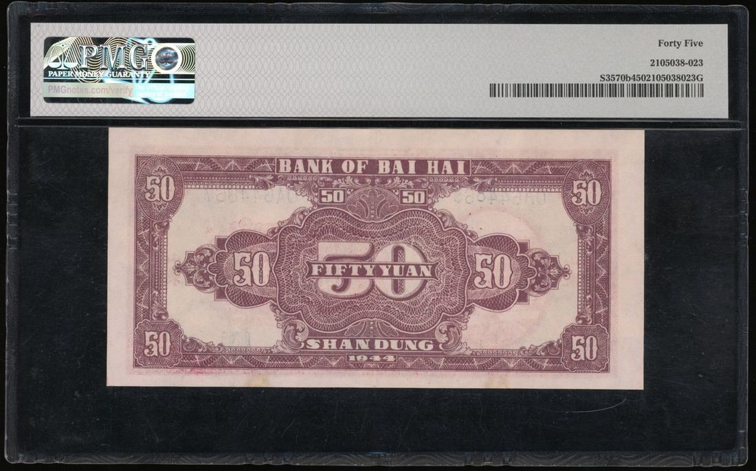 Bank of Bai Hai, China, 50 yuan, 1944, Shantung, serial number QA644867, (Pick S3570b), PMG 45.