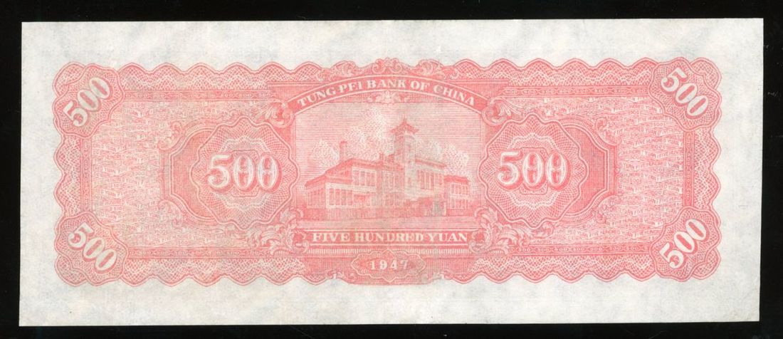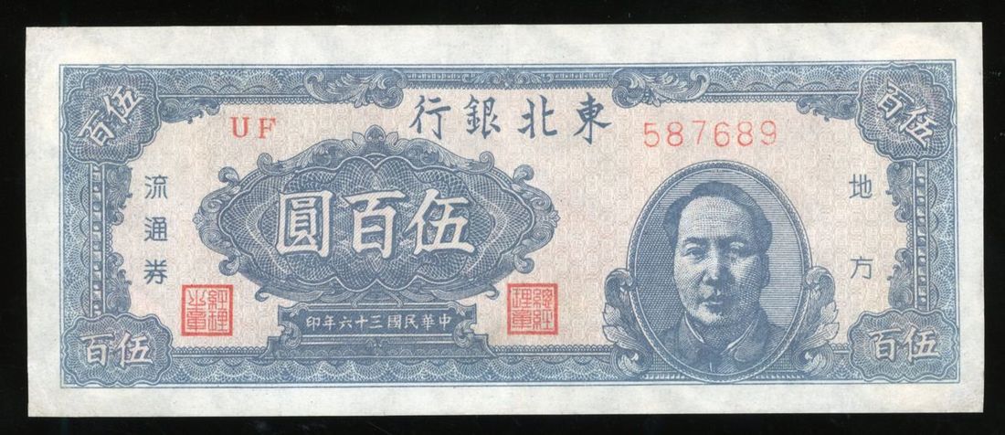 Tung Pei Bank of China, 500 yuan, 1947, serial number UF 587689, Mao at right,