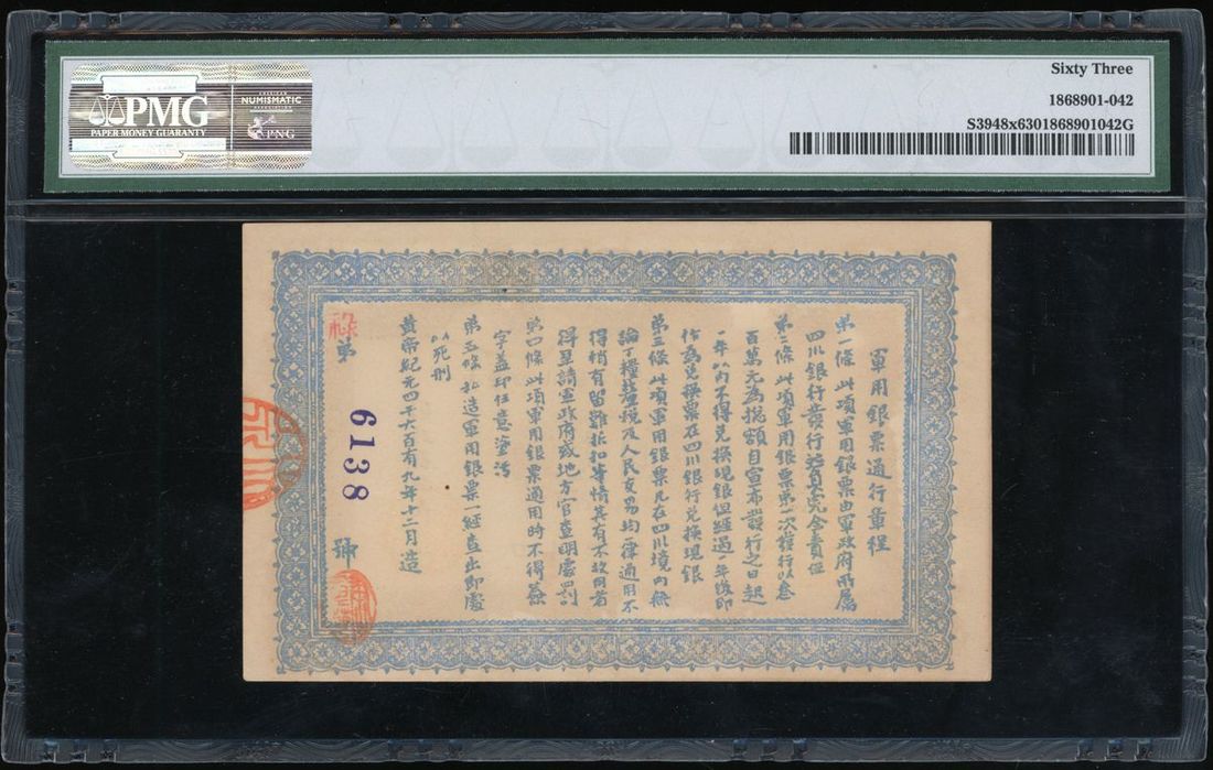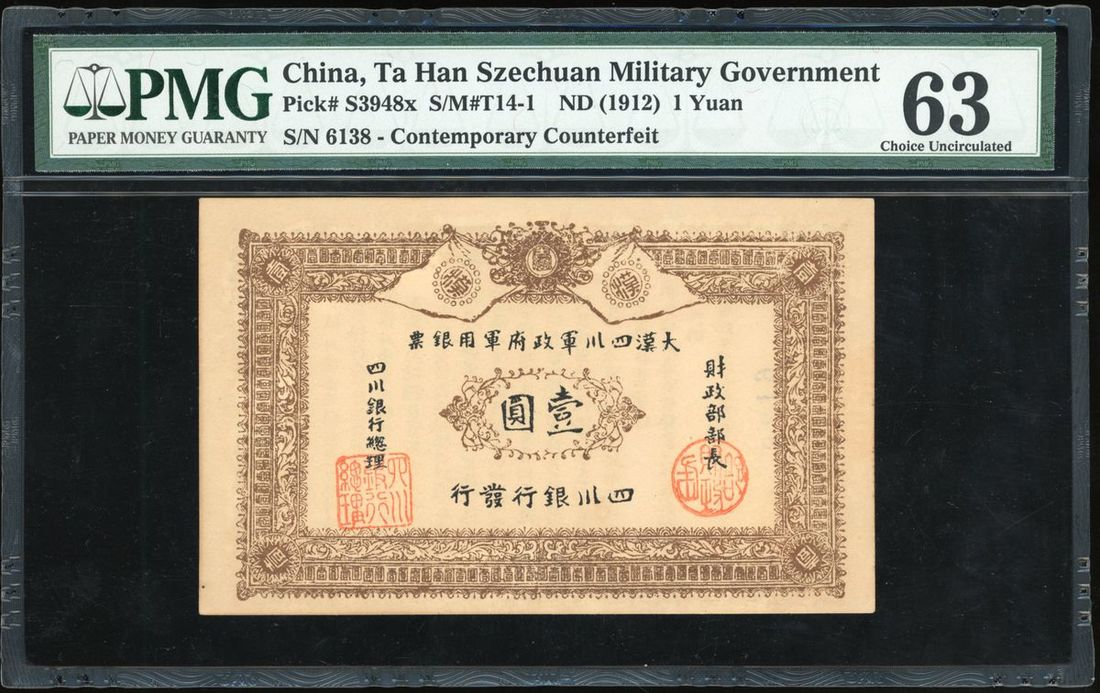 Ta Han Szechuan Military Government, China, CONTEMPORARY COUNTERFEIT 1 yuan, ND (1912), serial number 6138, (Pick S3948x), PMG 63
