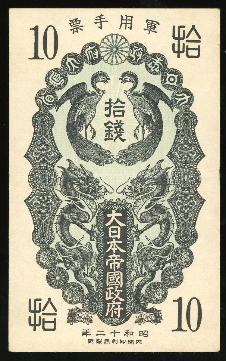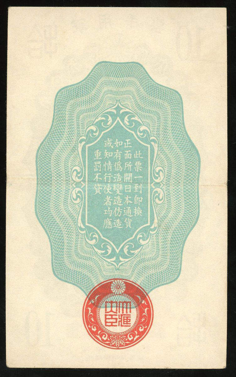 Japanese Imperial Government China, 10 sen, Showa Year 12(1937), no serial number, (Pick M1), well preserved, about extremely fine.