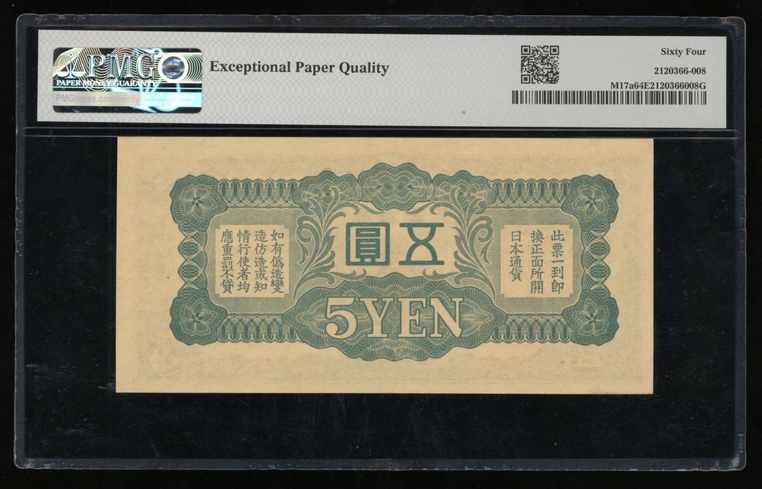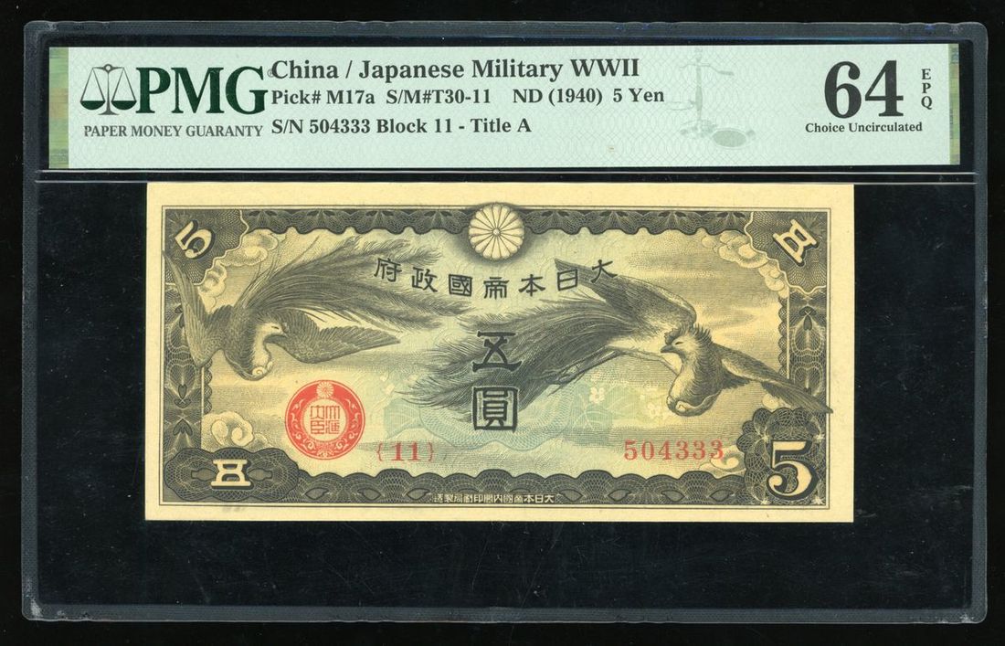 Japanese Military Issue, China, 5 Yen, ND (1040), serial number 504333, block number 11, (Pick M17a), PMG 64EPQ Choice Uncirculated
