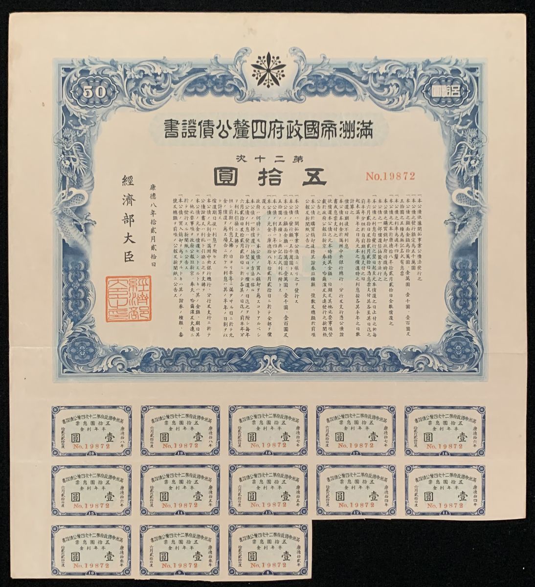 Manchuria 4% share, China, for 50 yuan, Kangde Year 8 (1941), serial number 19872, with coupons, very fine