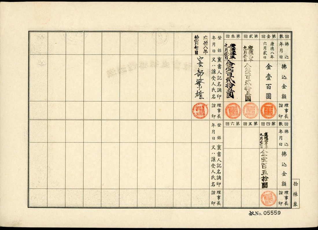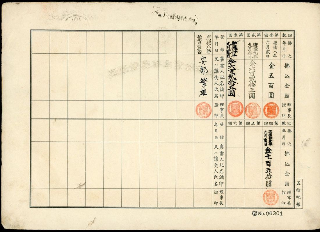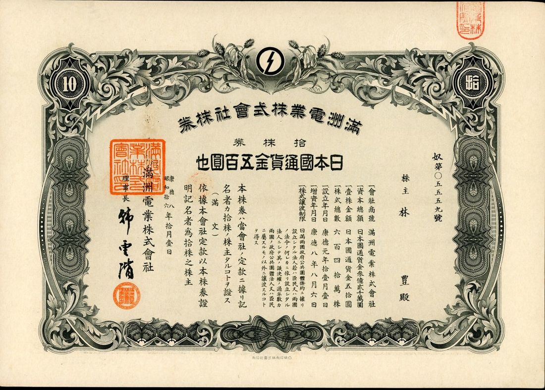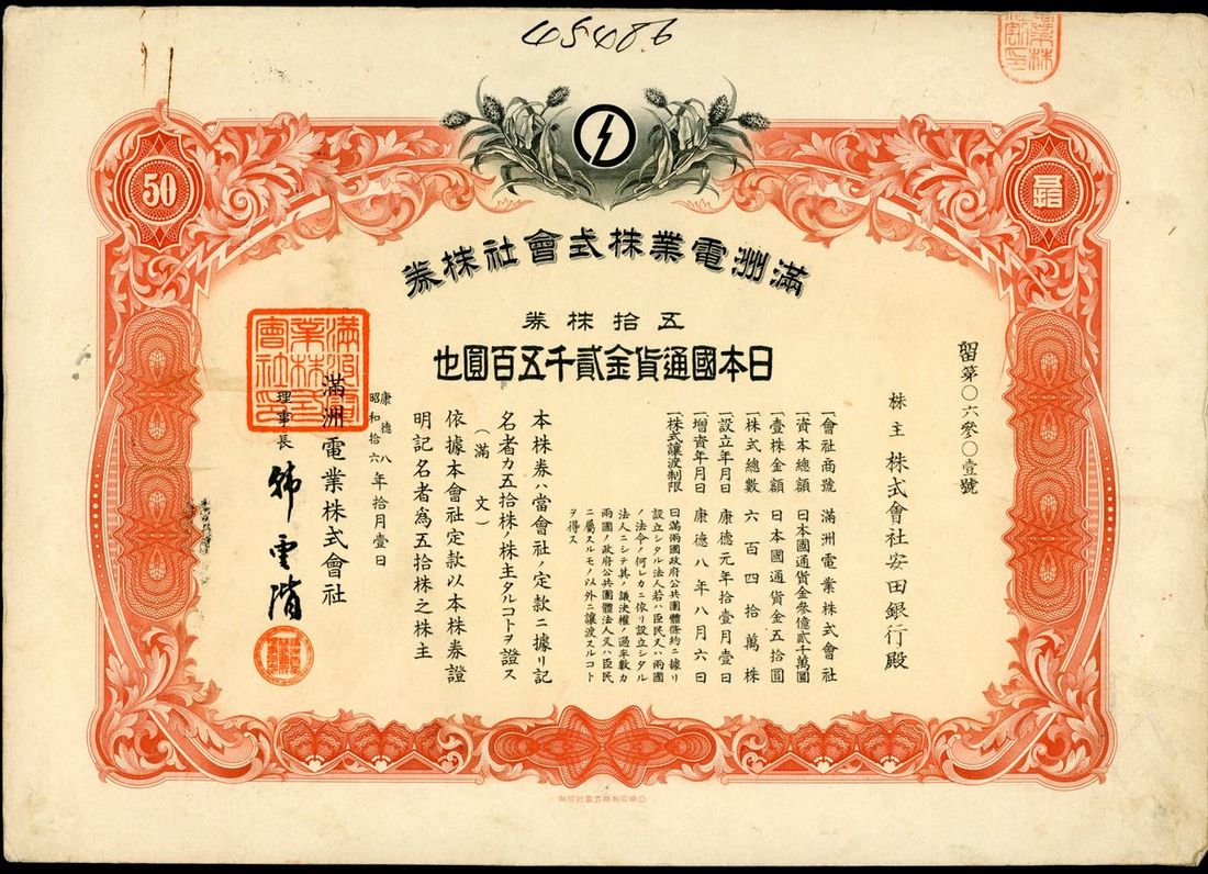 Manchuria Electric, China, a group of 2x share certificates, for 500 and 2500 yuan, Kangde Year 8 (1942), with various red chops and embossed stamps, interest redeemed at reverse, extremely fine (2)