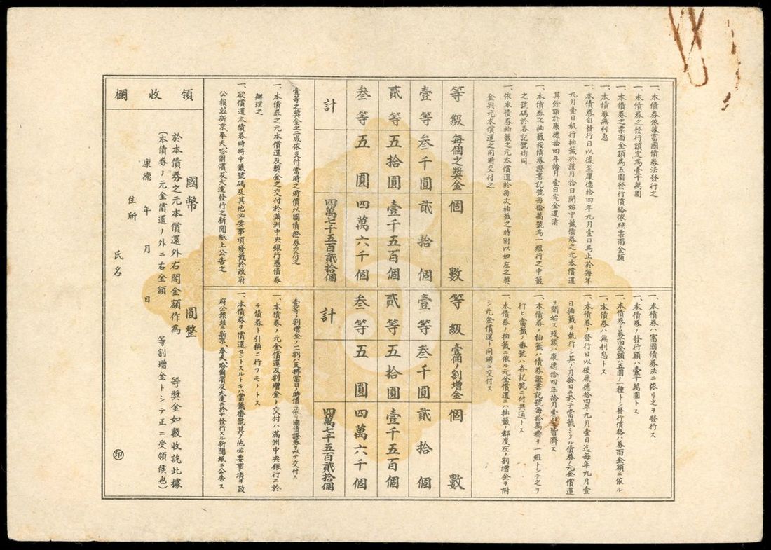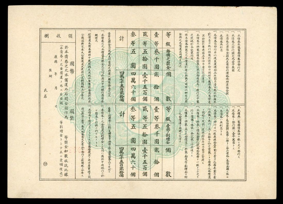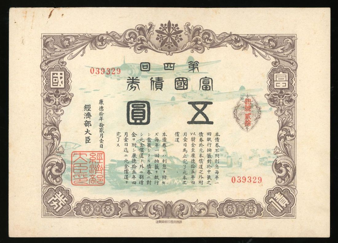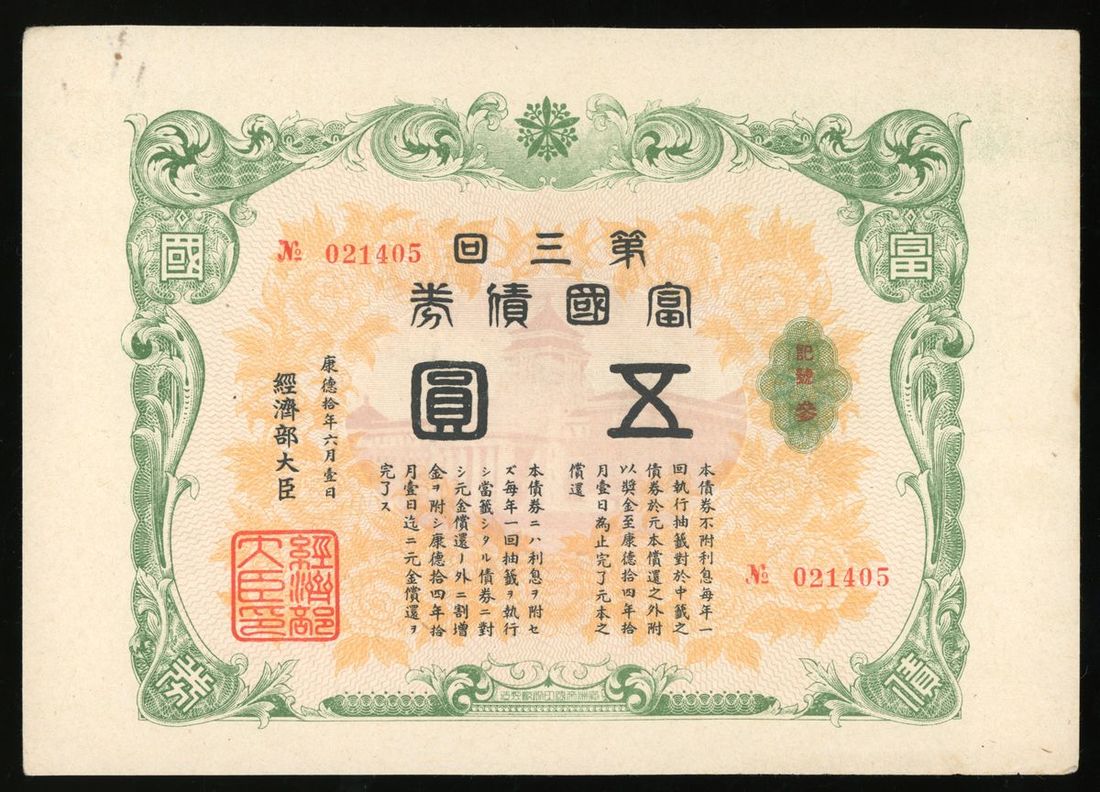 Manchuria, WWII Occupation, China, a pair of economic bond for 5 yuan, Kangde Year 10 (1944), series 3 and 4, handling at margins, one with paperclip rust, generally extremely fine (2)