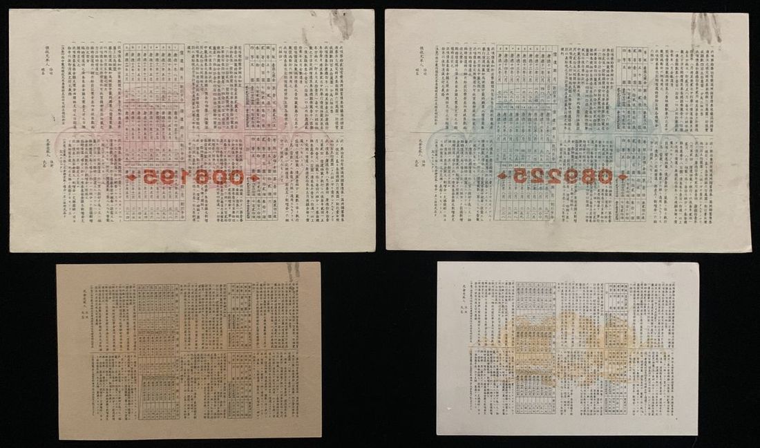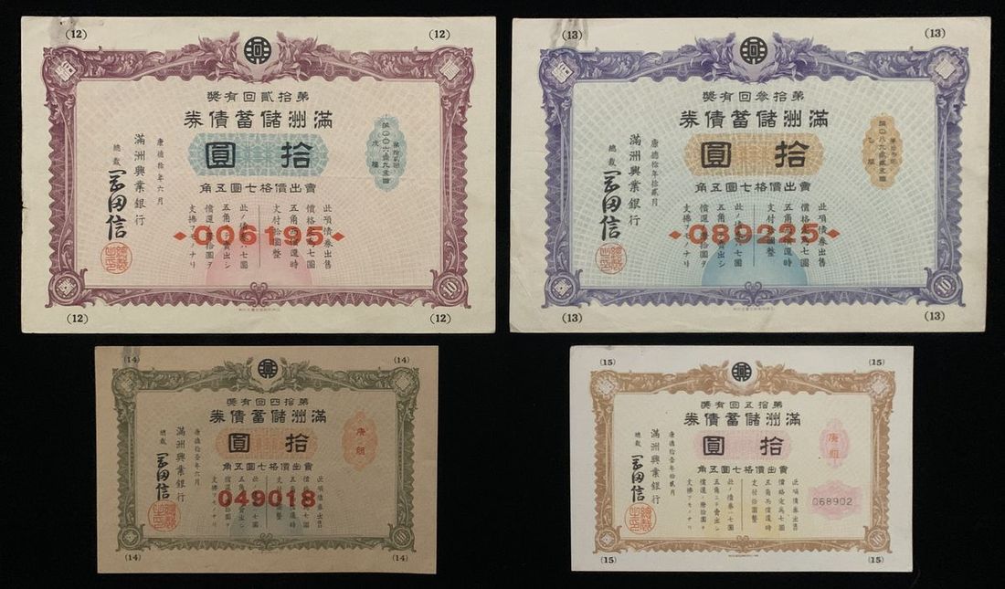 Manchuria Savings Bond, China, a group of 4x share certificates, for 10 yuan, Kangde Year 11 (1944), various series,