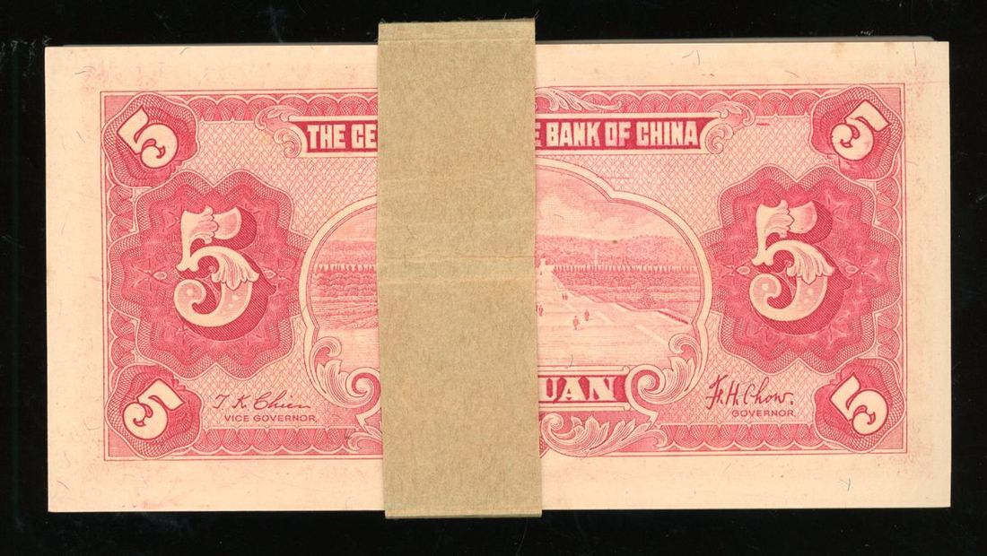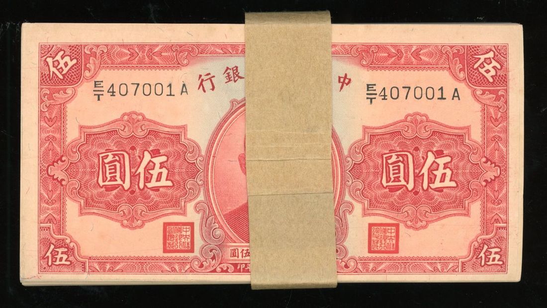 Central Reserve Bank of China, a consecutive group of 100x 5 yuan, Year 29(1940), serial numbers E/T407001A-7100A, (Pick J10e), about uncirculated, with original wrapper (100).
