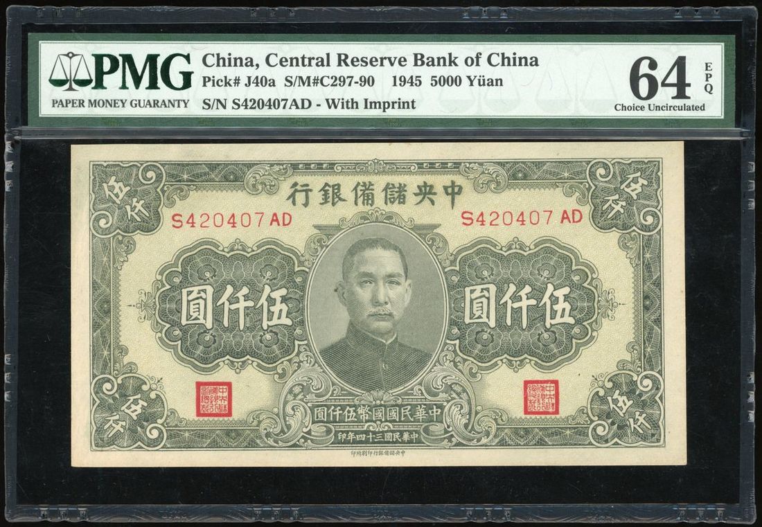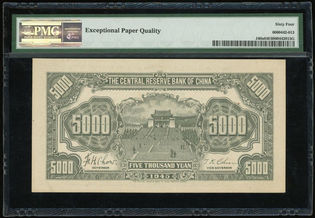 Central Reserve Bank of China, 5000 Yuan, Year 34(1945), serial number S420407AD, (Pick J40a), PMG 64EPQ Choice Uncirculated.
