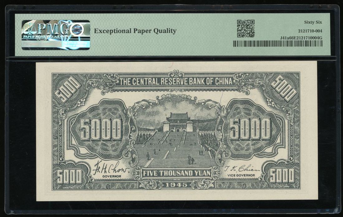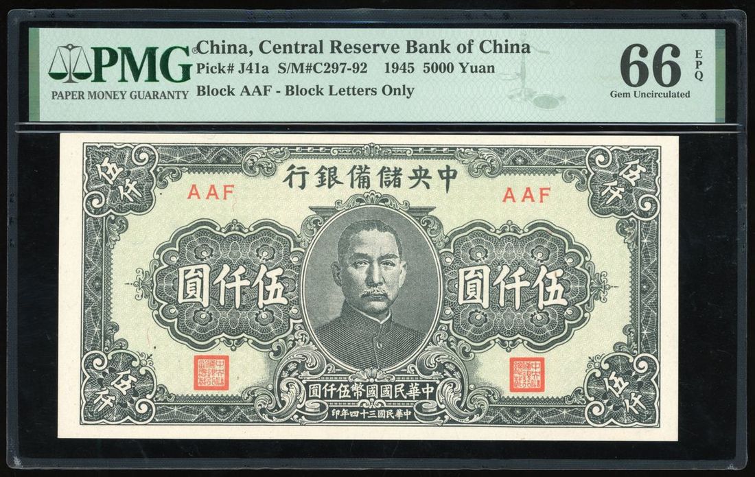 Central Reserve Bank of China, 5000 Yuan, Year 34 (1945), block AAF, (Pick J41a), PMG 66EPQ Gem Uncirculated. High grade example with only 3 better