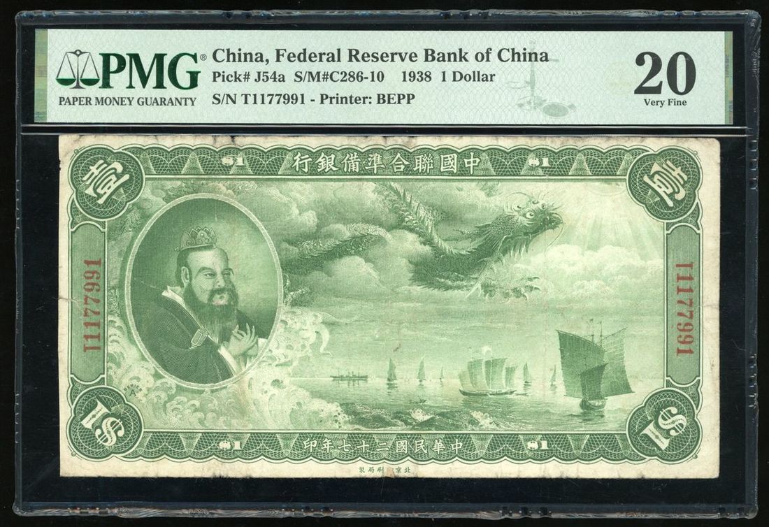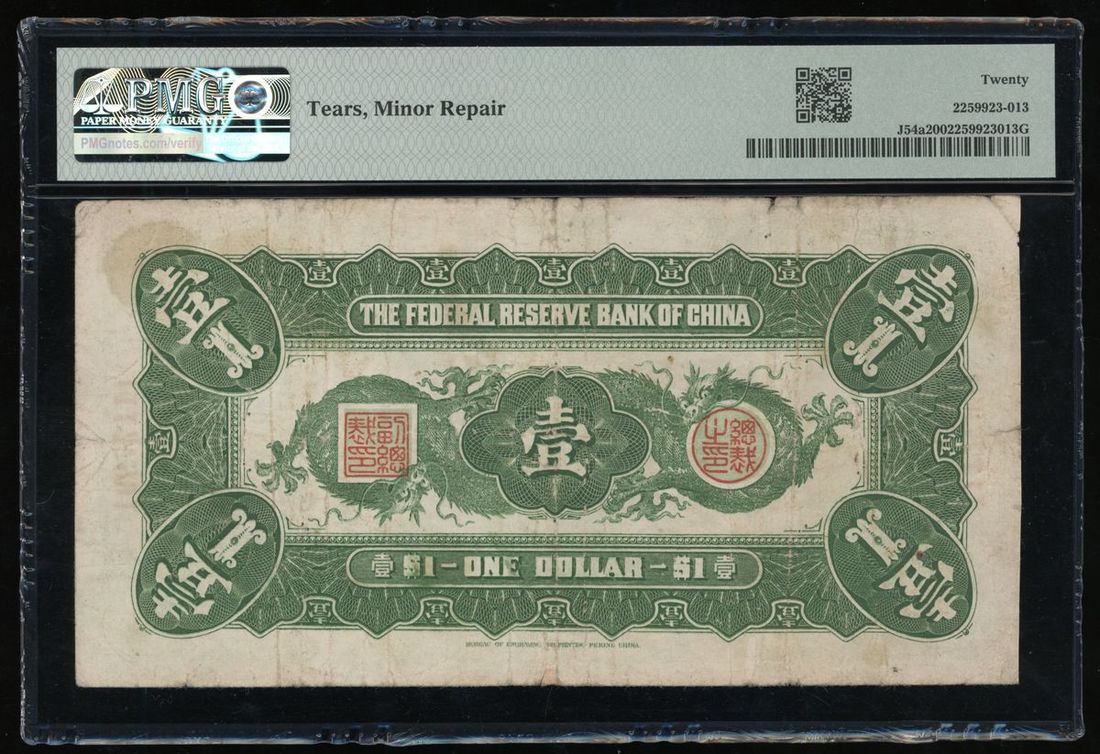 Federal Reserve Bank of China, 1 dollar, Year 27 (1938), serial number T1177991, (Pick J54a), PMG 20 Very Fine (Tears, Minor Repair)