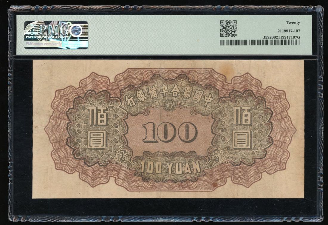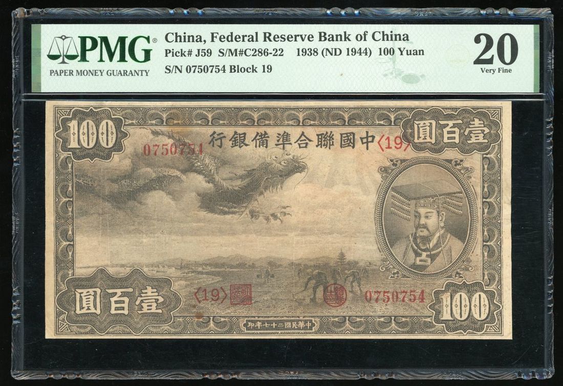 Federal Reserve Bank of China, 100 yuan, 1938, serial number 0750754, block number 19, (Pick J59), PMG 20 Very Fine