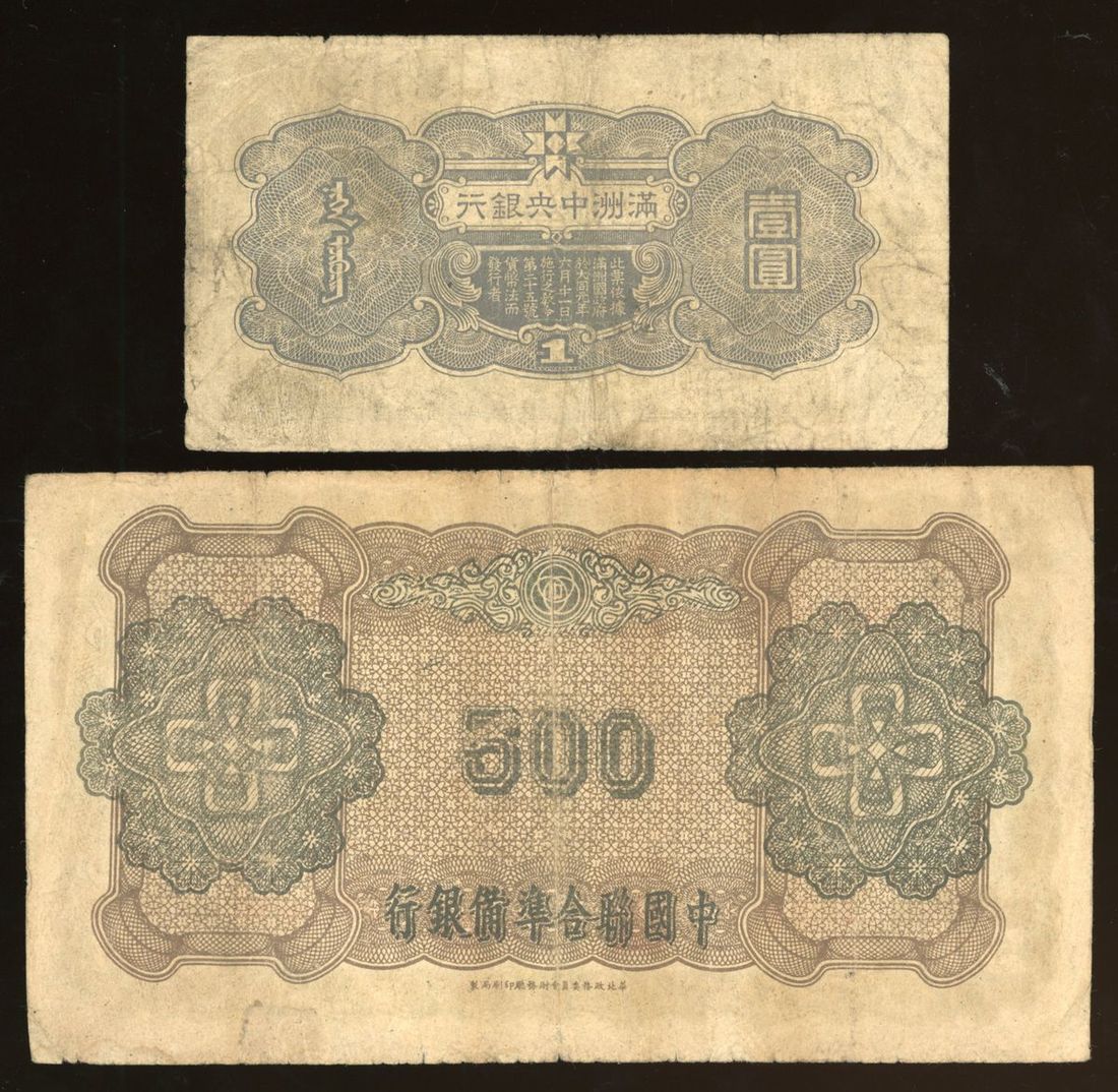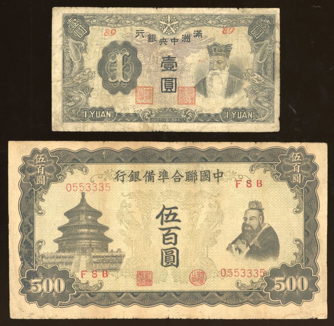 China Puppet Banks, a group of 3x including, Central Bank of Manchukuo 1994 1 yuan, Federal Reserve Bank of China 1943 500 yuan (2), (Pick 135b, J78a), PMG 30, Very Fine (3)