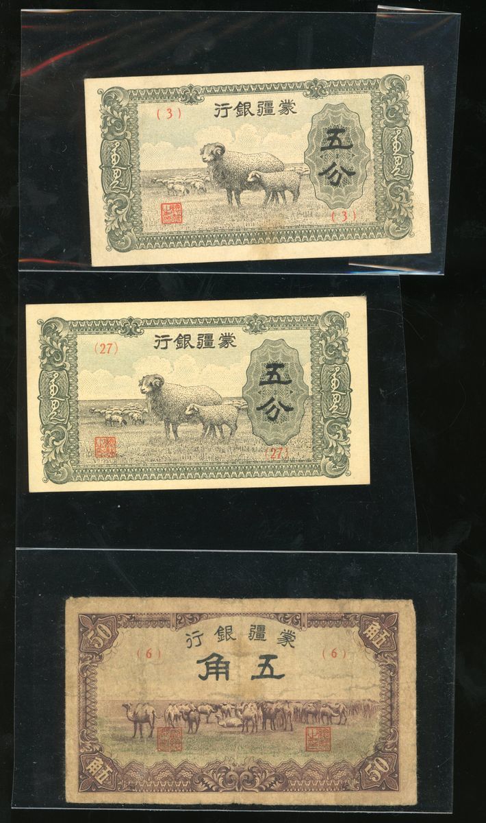 Mengchiang Bank, China, a group of 4x, including a pair of 5 fen, ND (1940); 5 chiao, ND (1940); 100 yuan, ND (1945);