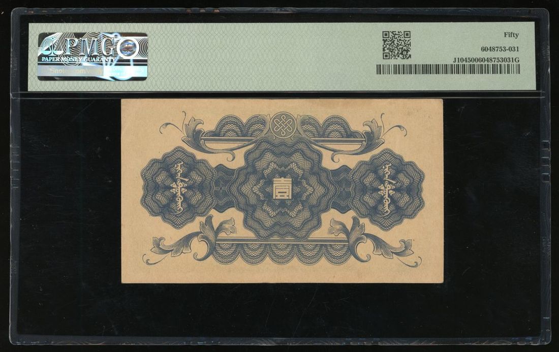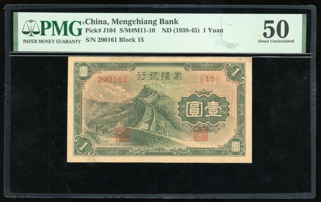 Mengchiang Bank, China, 1 yuan, ND (1938-45), Block 15, serial number 290161, (Pick J104), PMG 50 About Uncirculated