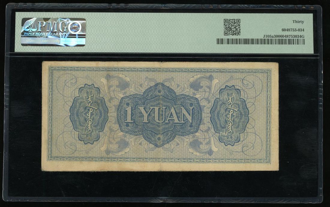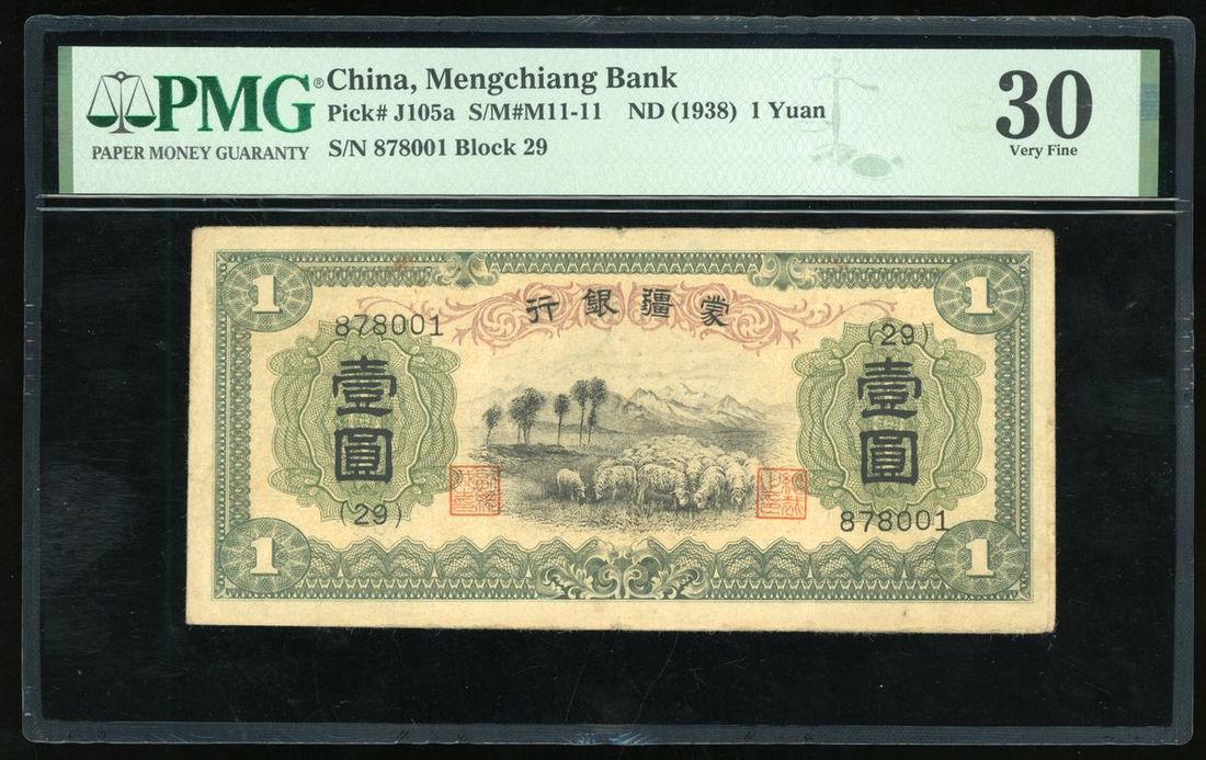 Mengchiang Bank, China, 1 yuan, ND (1938), Block 29, serial number 878001, (Pick J105a), PMG 30 Very Fine