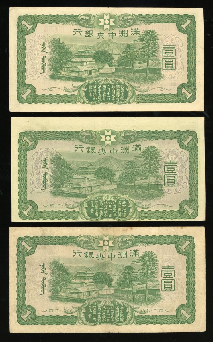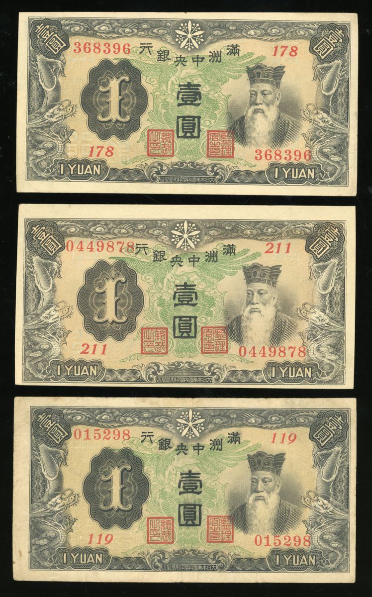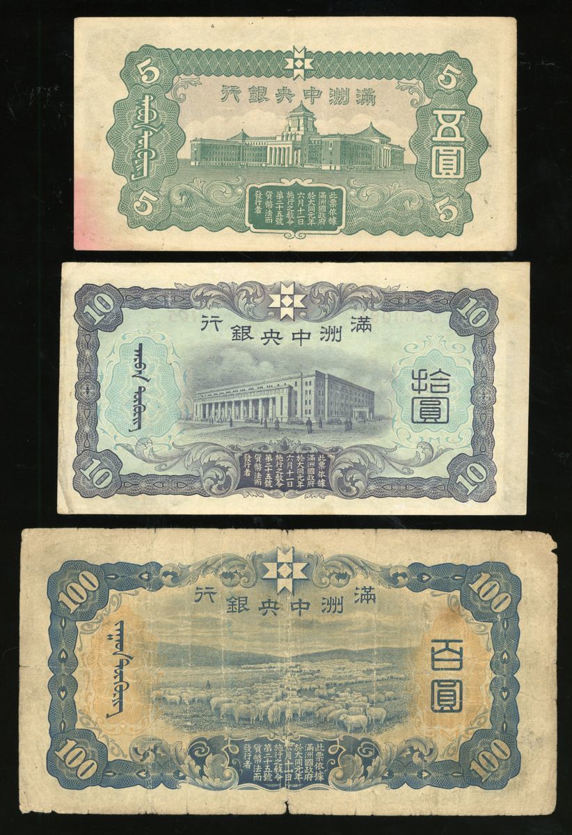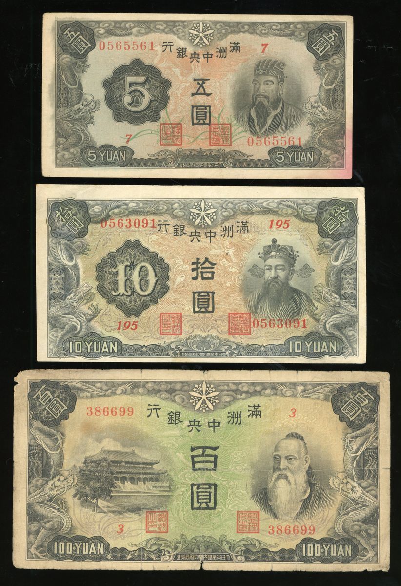 Central Bank of Manchukuo, China, a group of 10 notes, ND (1932-33 and 1944), consists of 3x 1 yuan, 1x 5 yuan, 1x 10 yuan, and 5x 100 yuan (Pick J130, J136, J132, J133 and J138), fine to very fine in general, viewing recommended, sold as seen no return (10).