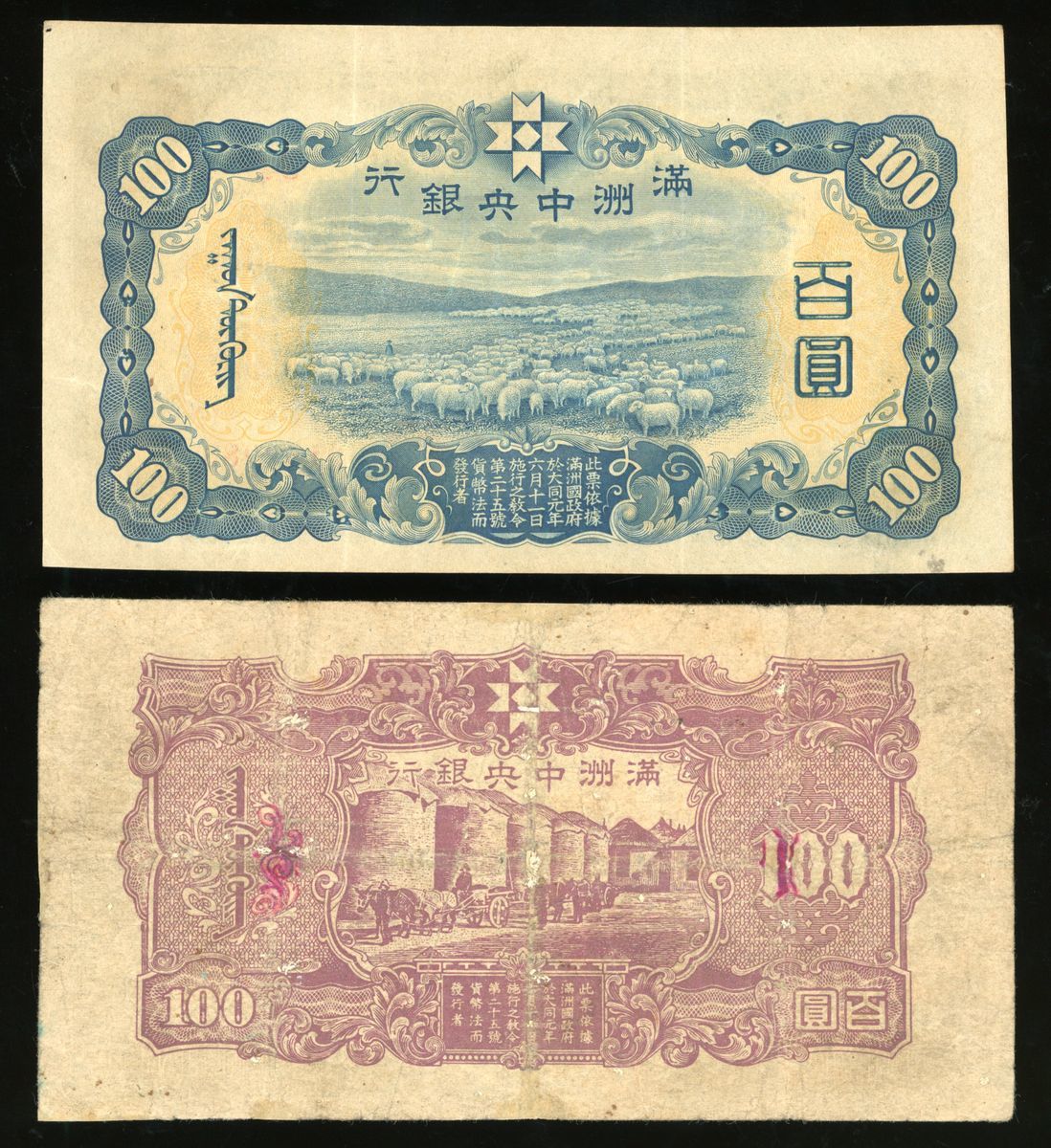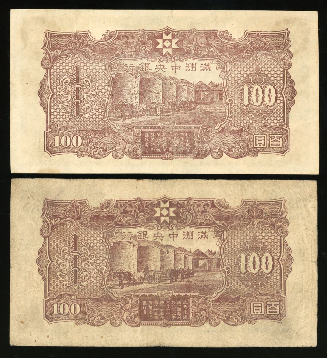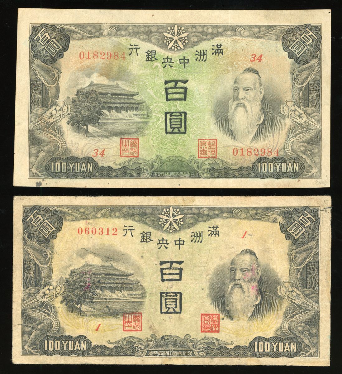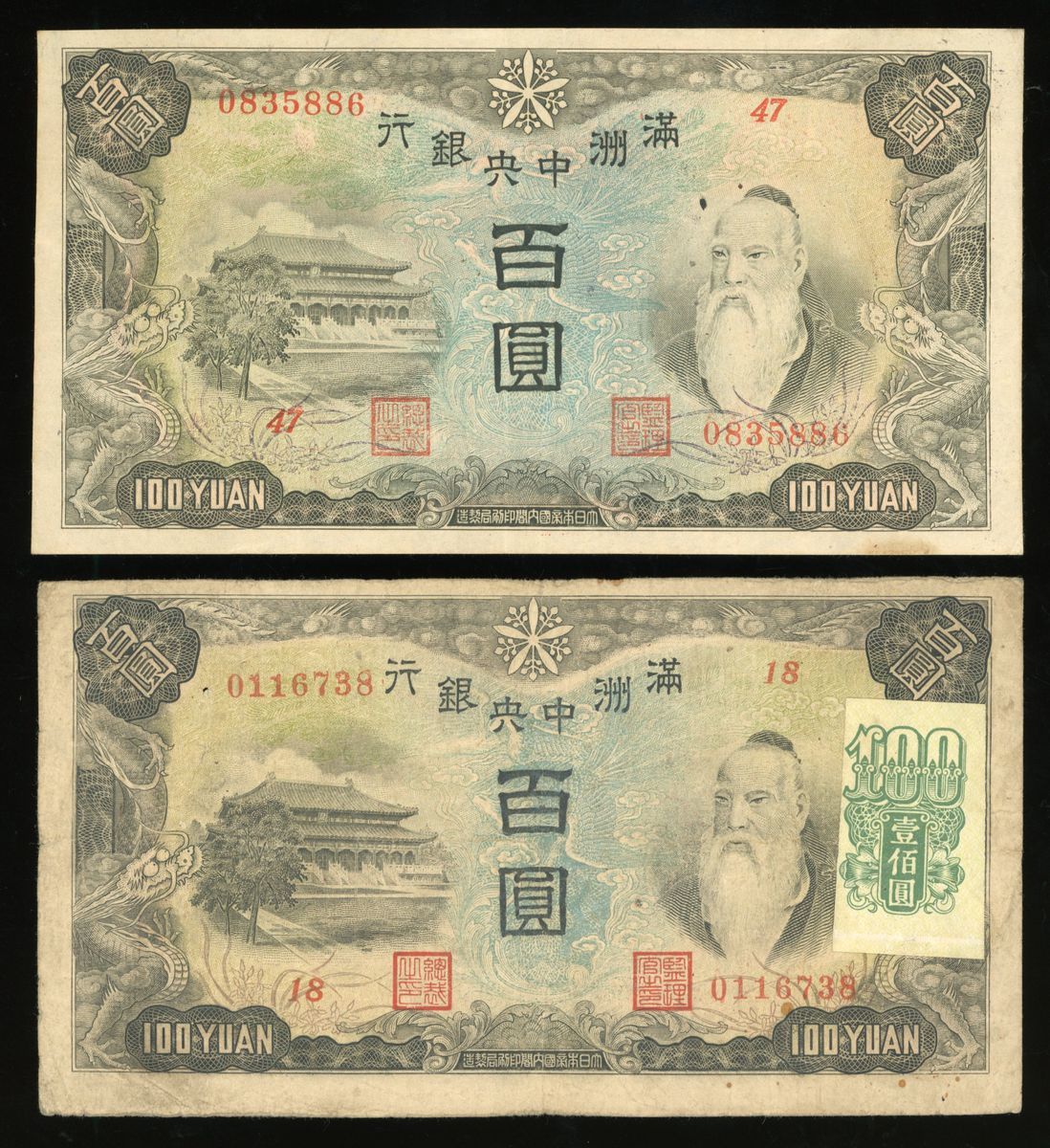 Central Bank of Manchukuo, China, a group of 10 notes, ND (1932-33 and 1944), consists of 3x 1 yuan, 1x 5 yuan, 1x 10 yuan, and 5x 100 yuan (Pick J130, J136, J132, J133 and J138), fine to very fine in general, viewing recommended, sold as seen no return (10).