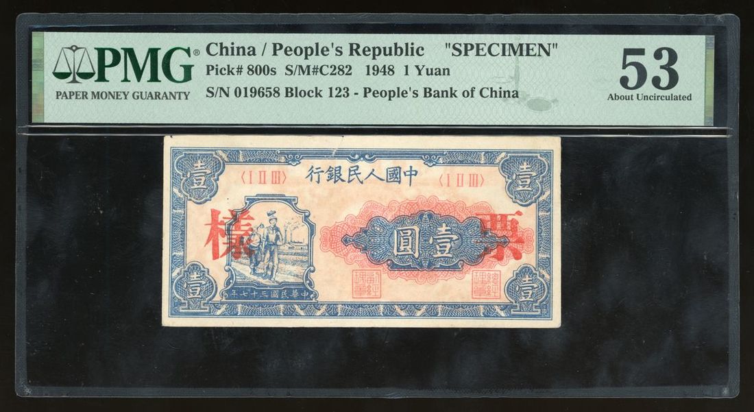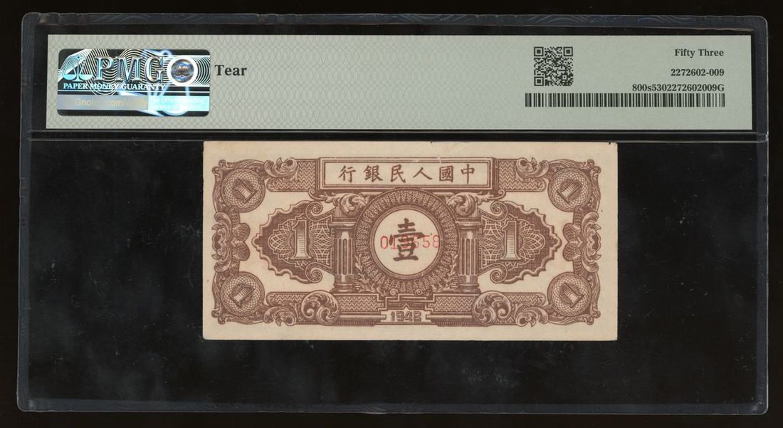 People's Bank of China, 1st Series Renminbi, 1948, specimen 1 yuan, 'Farmer and Factory Worker', control number 019658, (Pick 800s), PMG 53 About Uncirculated (Tear)