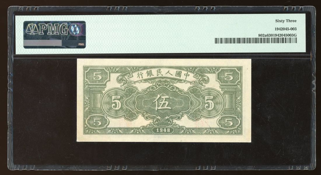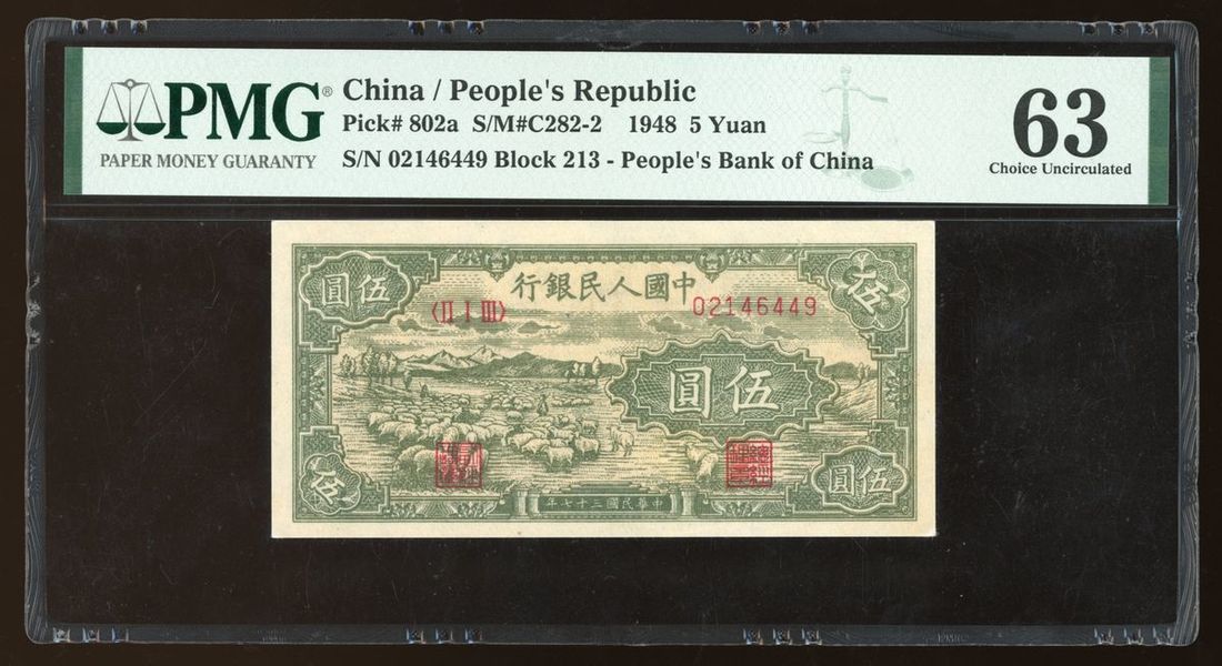 People's Bank of China, 1st Series Renminbi, 1948, 5 Yuan, 'Sheep Herd', serial number II I III 02146449, (Pick 802a), PMG 63, Choice Uncirculated
