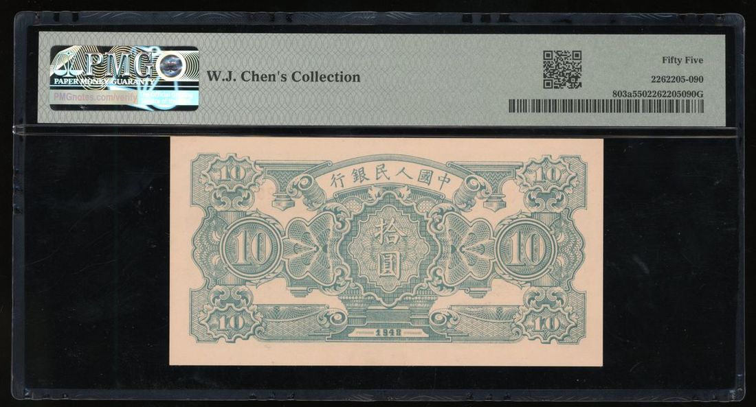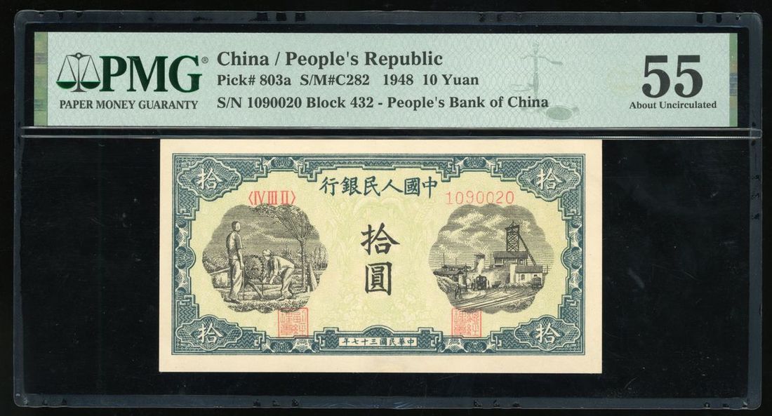 People's Bank of China, 1st Series Renminbi, 1948, 10 Yuan, 'Minning and Well Digging', serial number IV III II 1090020, (Pick 803a), PMG 55, About Uncircullated. W. J. Chen's Collection