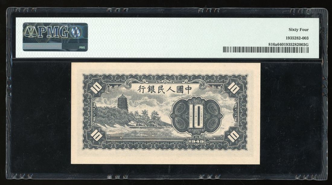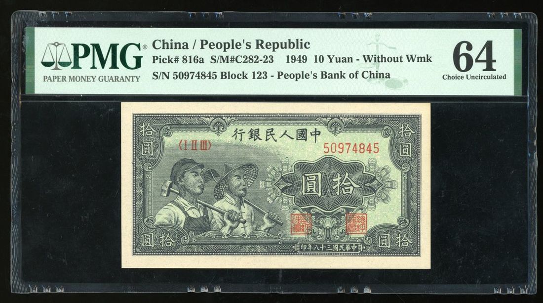 People's Bank of China, 1st Series Renminbi, 1949, 10 Yuan, "Farmer and Factory Worker", serial number I II III 50974845, (Pick 816a), PMG 64, Choice  Uncirculated