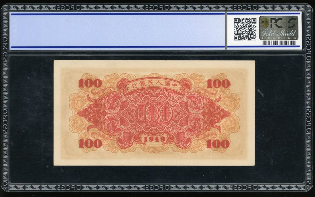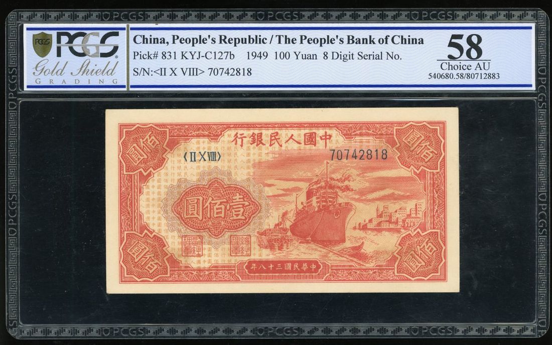 People's Bank of China, 1st Series Renminbi, 1949, 100 yuan, "Red Ship", serial number II X VIII 70742818, (Pick 831), PCGS Gold Shield 58.