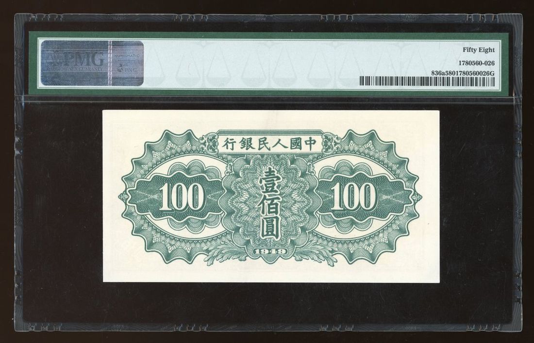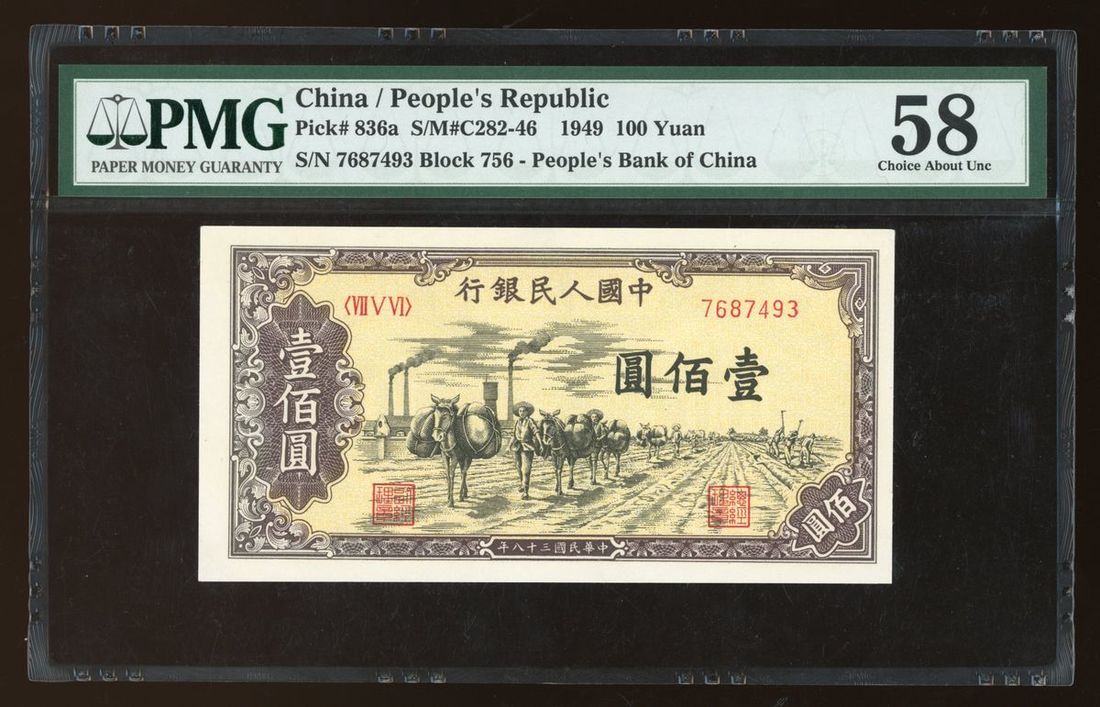 People's Bank of China, 1st Series Renminbi, 1949, 100 Yuan, "Donkey Train", serial number VII V VI 7687493, (Pick 36a), PMG 58, Choice About Uncirculated