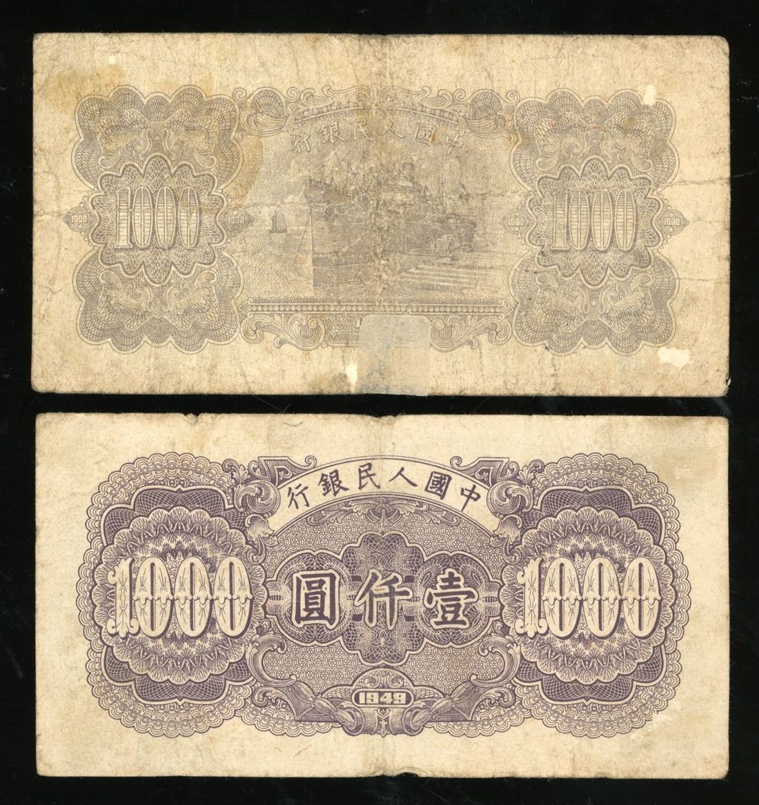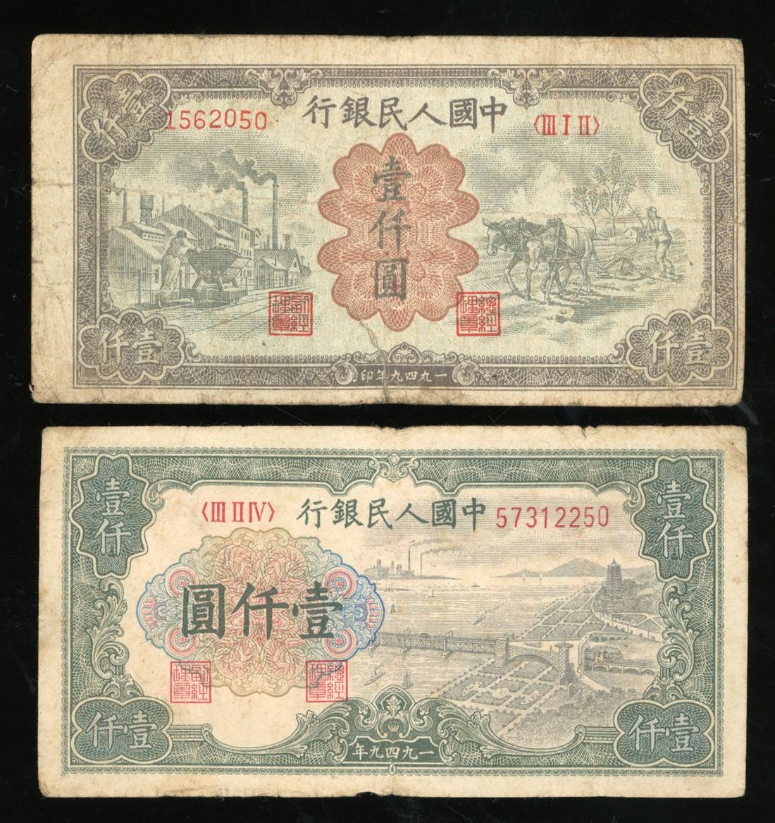 People's Bank of China, 1st Series Renminbi, 1949, 1000 yuan (2), ''Mine Cart and Factory" and "Qiantang Bridge", serial numbers III I II 1562050 and III II IV 57312250, (Pick 850 and 847), very good to fine, toning at edges, viewing recommended, so as seen no return(2).