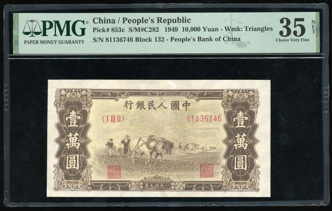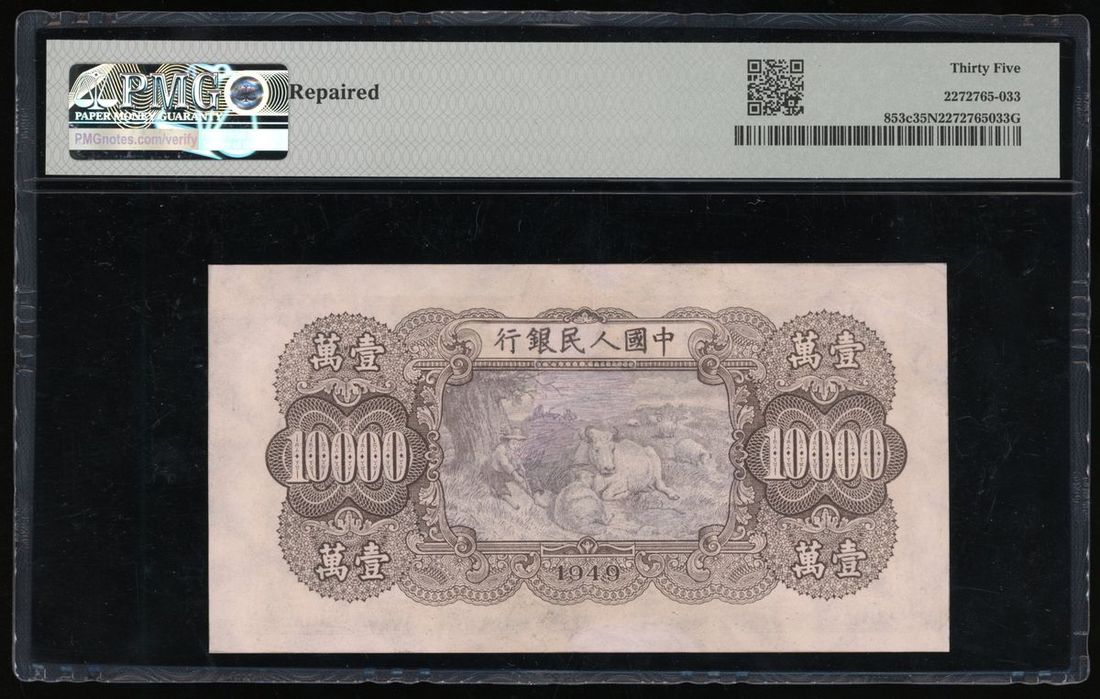 People's Bank of China, 1st Series Renminbi, 1949, 10000 yuan, "Two Horses Ploughing", serial number I III II 81136746, (Pick 853c), PMG 35NET Choice Very Fine (Repaired)