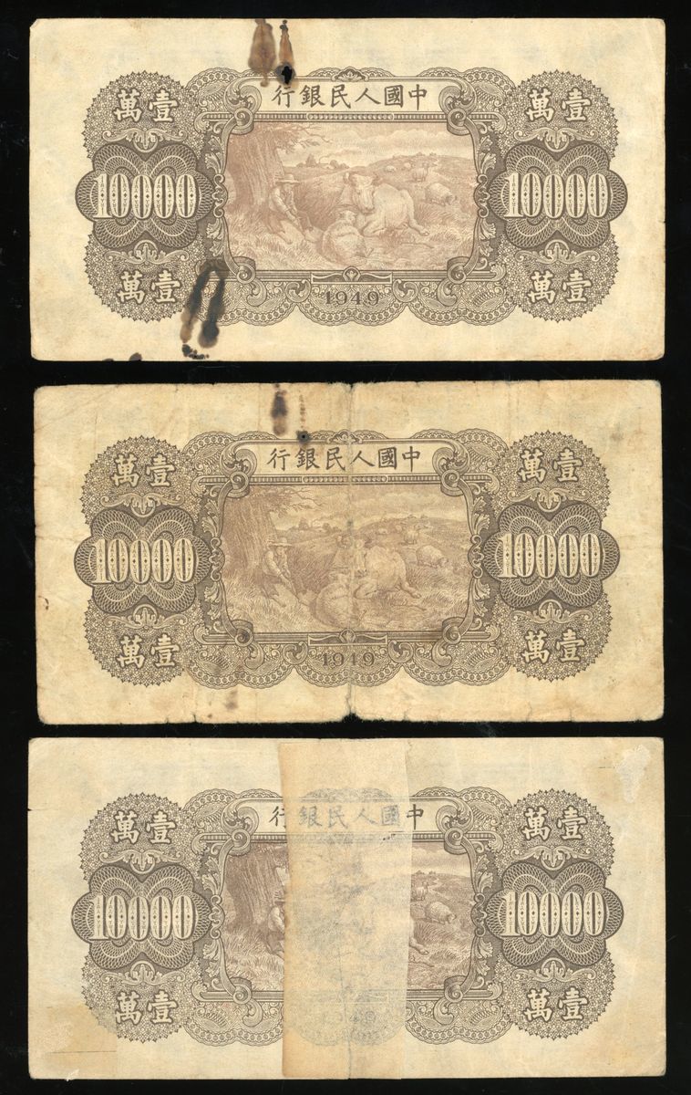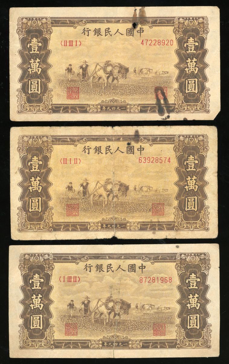 People's Bank of China, 1st Series Renminbi, 1949, 10000 yuan (3), ''Two Horses Ploughing', serial numbers I III II 87281968, III I II 63928574 and II III I 47228920, (Pick 853), very fine or so, 2 with rust and hole, viewing recommended, sold as seen no return (3).