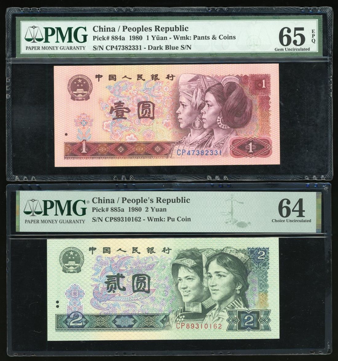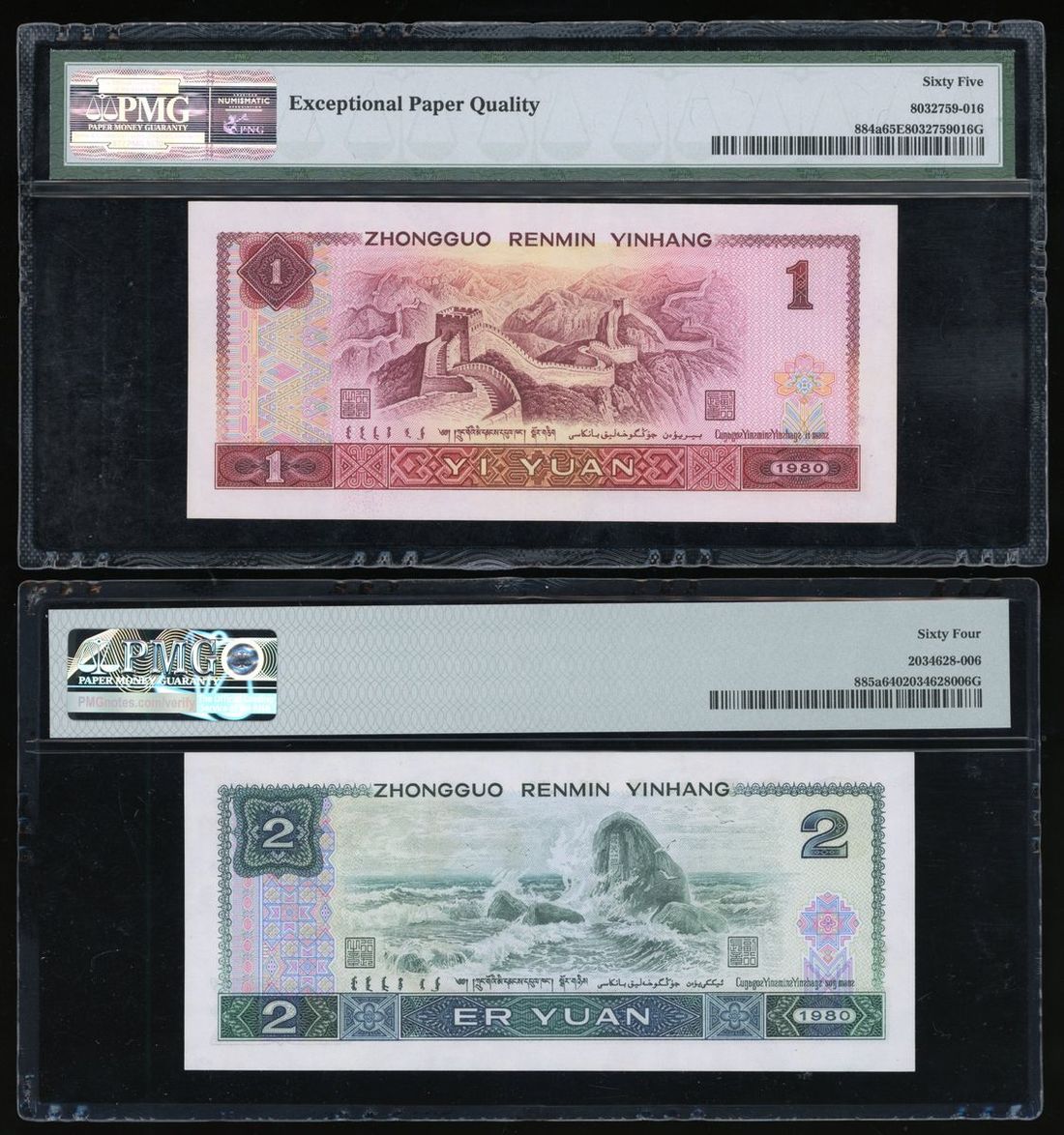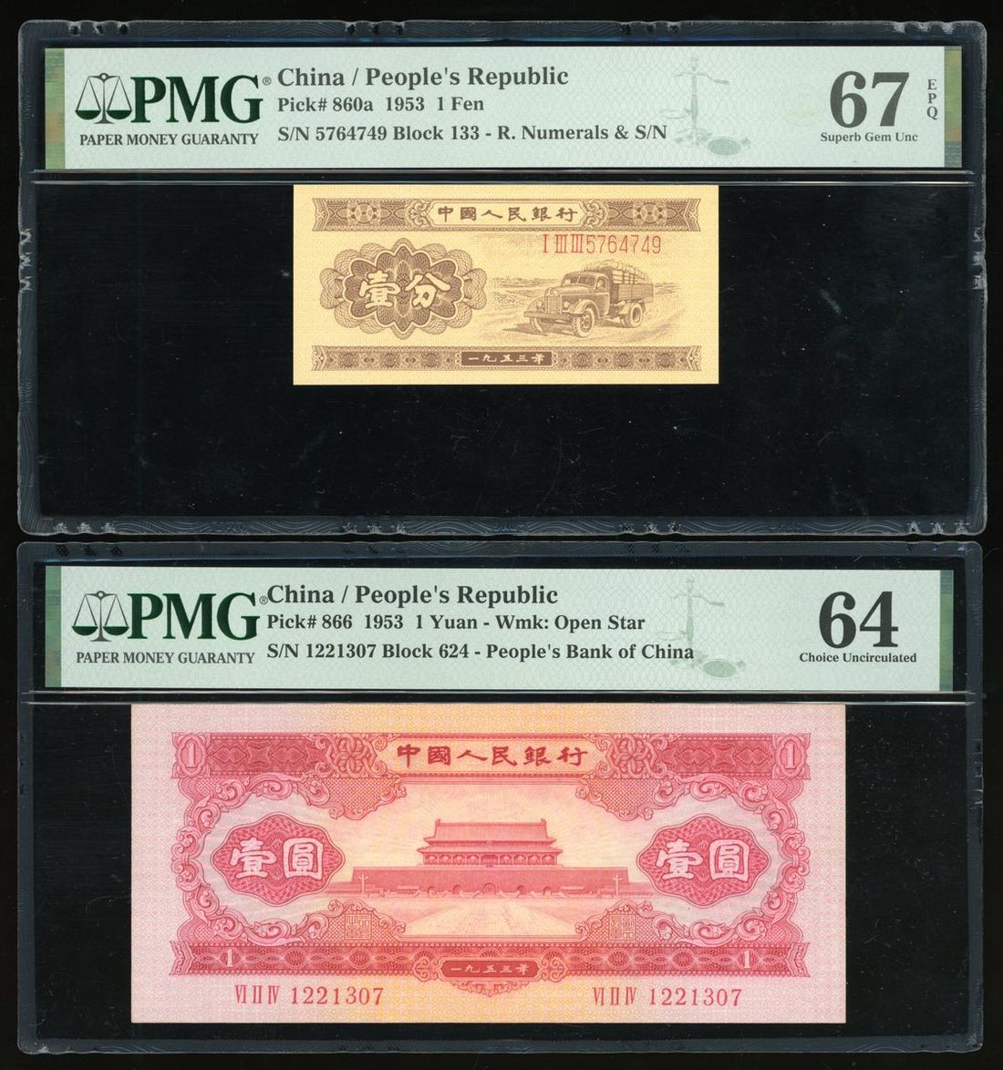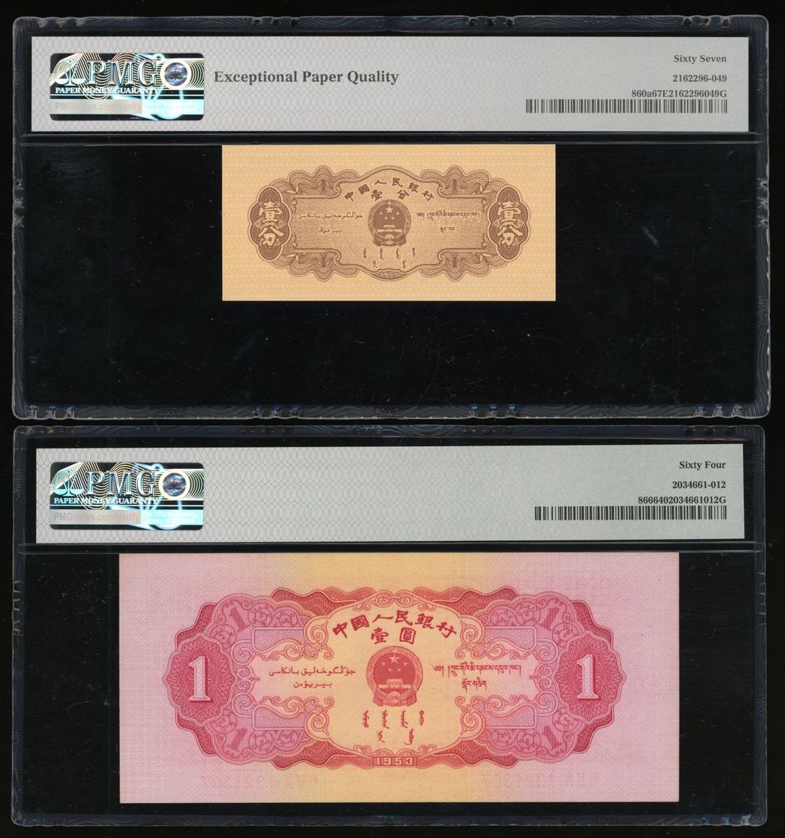 People's Bank of China, a group of 4x, including: 2nd Series Renminbi, 5 fen and 1 yuan, 1953; 4th Series Renminbi, 1 yuan and 2 yuan, 1980; serial numbers, I III III 5764749, VI II IV 1221307, CP47382331 and CP89310162 respectively,