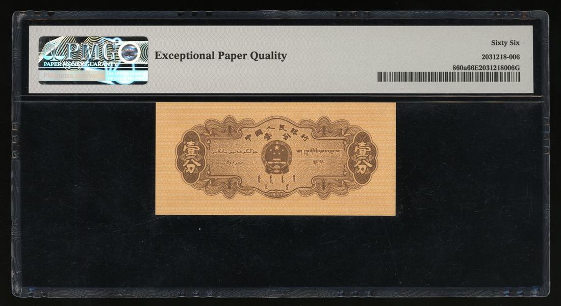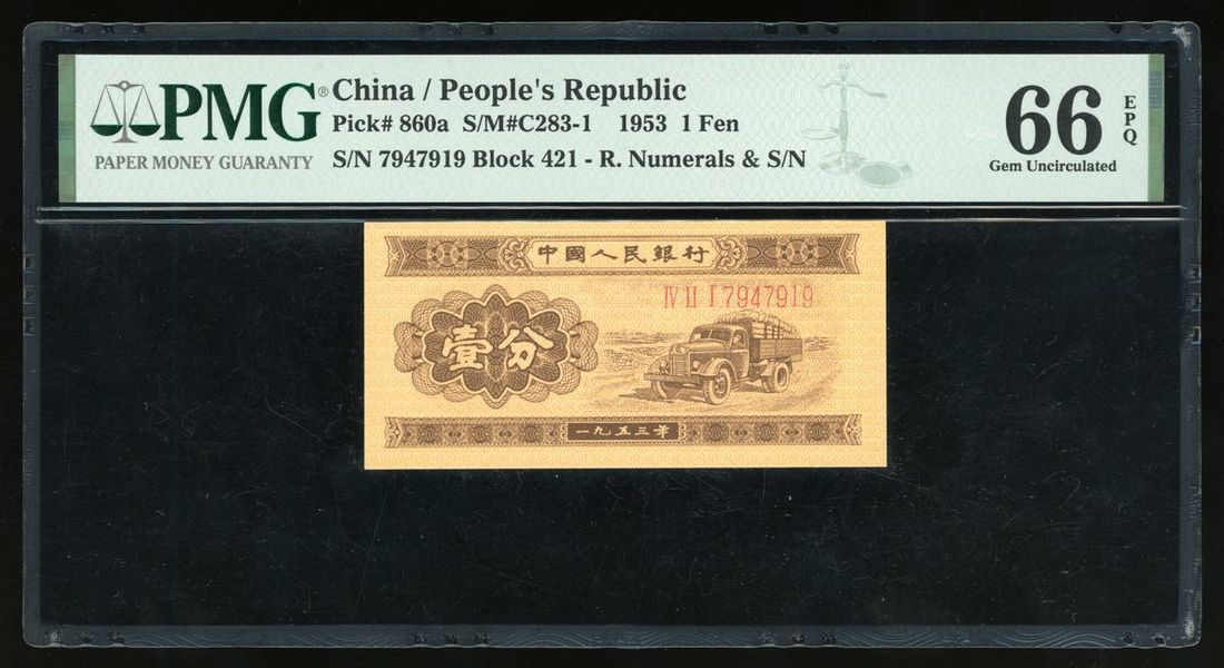 People's Bank of China, 2nd Series Renminbi, 1953, 1 fen, serial number IV II I 7947919, (Pick 860a), PMG 66EPQ Gem Uncirculated.