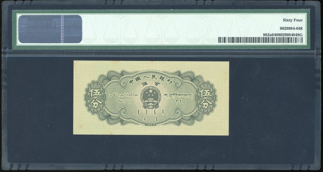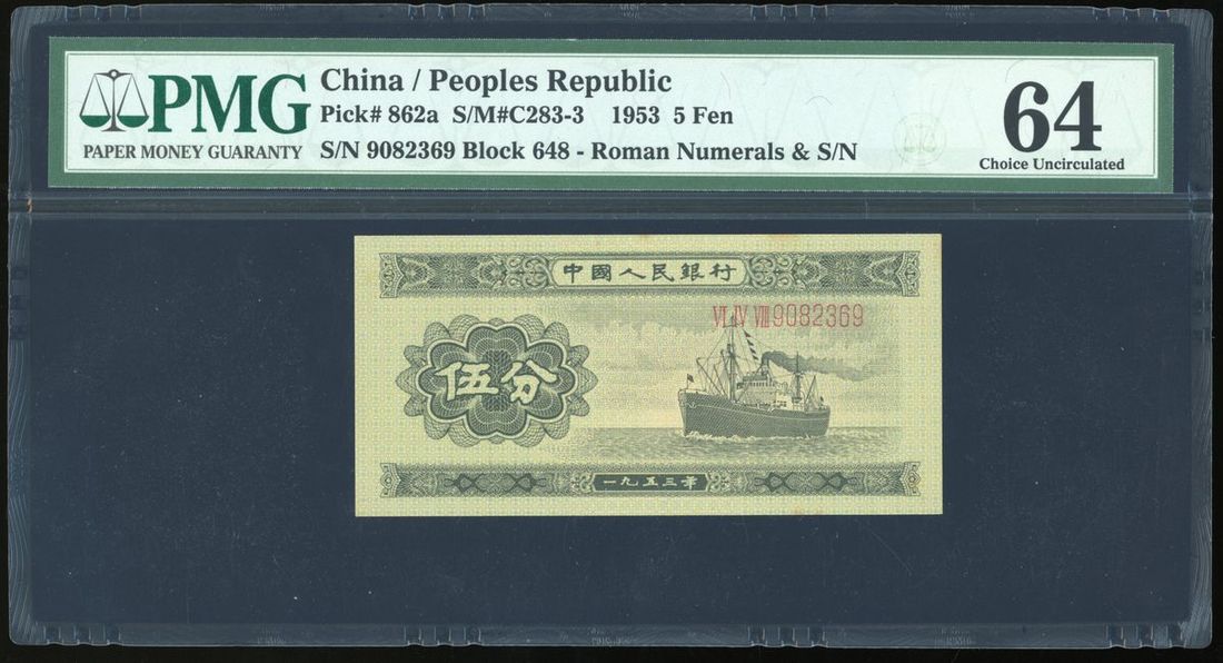 People's Bank of China, 2nd Series Renminbi, 1953, 5 fen, serial number VI IV VIII 9082369, (Pick 862a), PMG 64 Choice Uncirculated.