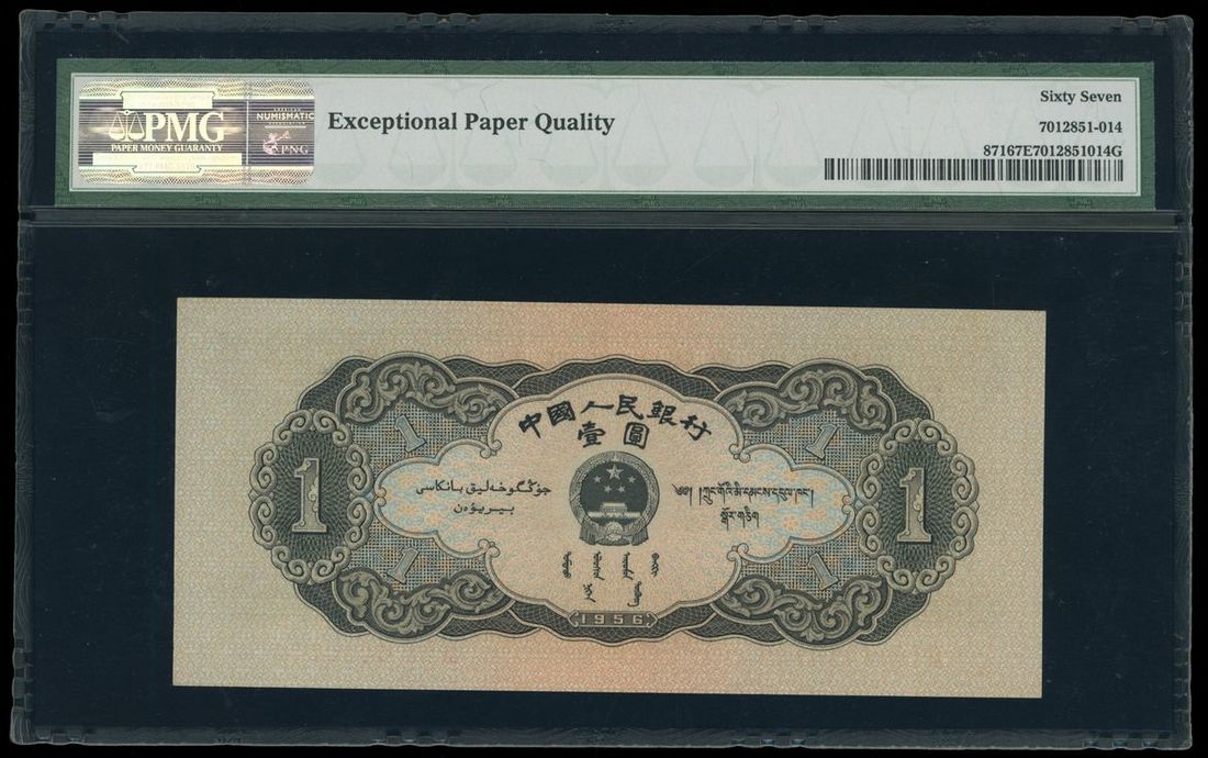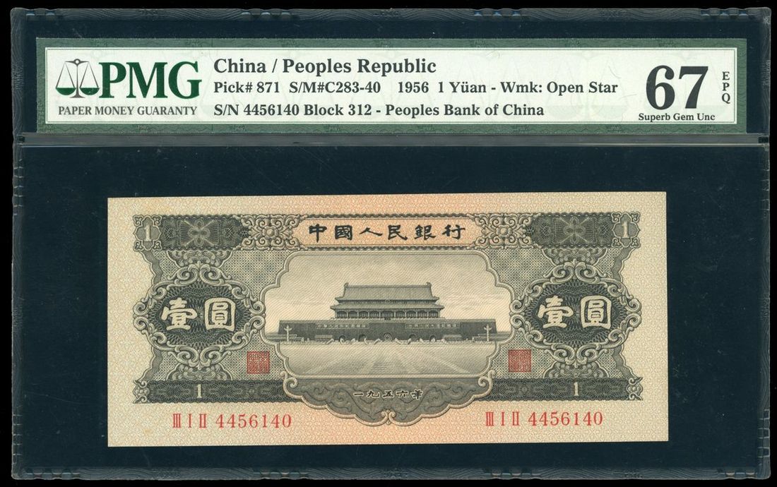 People's Bank of China, 2nd Series Renminbi, 1956, 1 Yuan, serial number III I II 4456140, open star watermark, (Pick 871), PMG 67EPQ Superb Gem Uncirculated