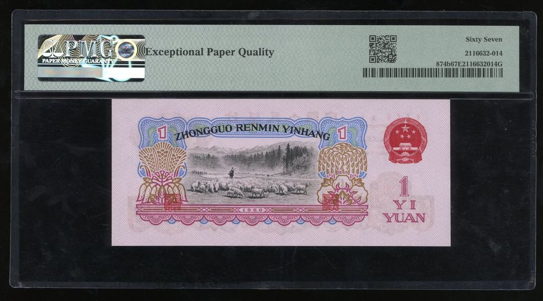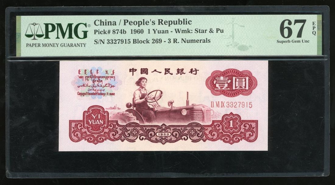 People's Bank of China, 3rd Series Renminbi, 1960, 1 yuan, serial number II VI IX 3327915, star and ancient bu coin watermark,