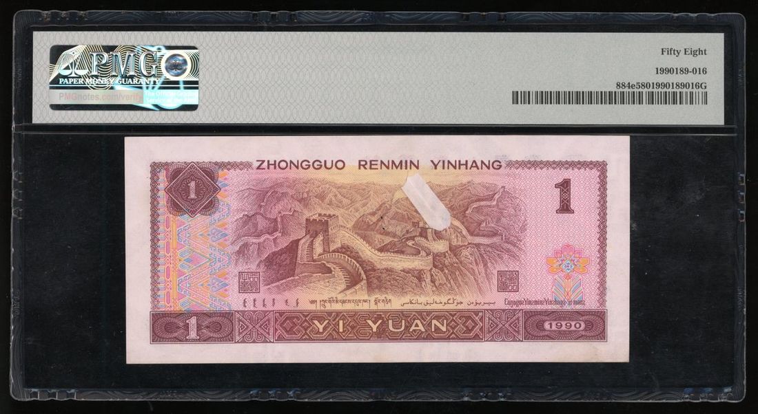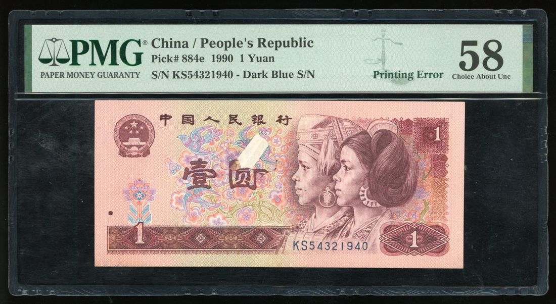 People's Bank of China 4th Series Renminbi, 1990, ERROR 1 Yuan, serial number KS54321940, accordion fold error,